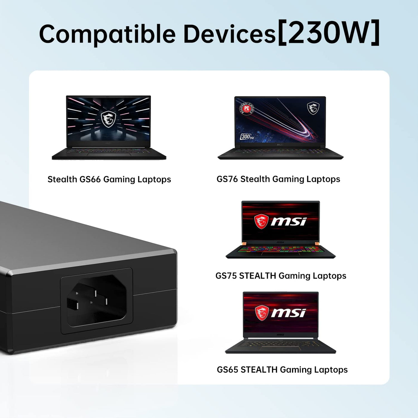 - Q: Is this charger compatible with MSI GS65 Stealth laptops? A: Yes, this 230W charger is compatible with various models of MSI GS65 Stealth laptops, including GS65 Stealth-002, 004, 005, and more. It is designed to meet the specifications required for optimal performance.