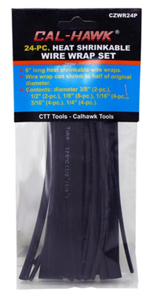 Q: What sizes of heat shrinkable wire wraps are included in the set?A: The 24-pc. Heat Shrinkable Wire Wrap Set includes a variety of sizes: (2 pcs.) 3/8" Diameter, (2 pcs.) 1/2" Diameter, (8 pcs.) 1/8" Diameter, (4 pcs.) 1/16" Diameter, (4 pcs.) 3/16" Diameter, and (4 pcs.) 1/4" Diameter.