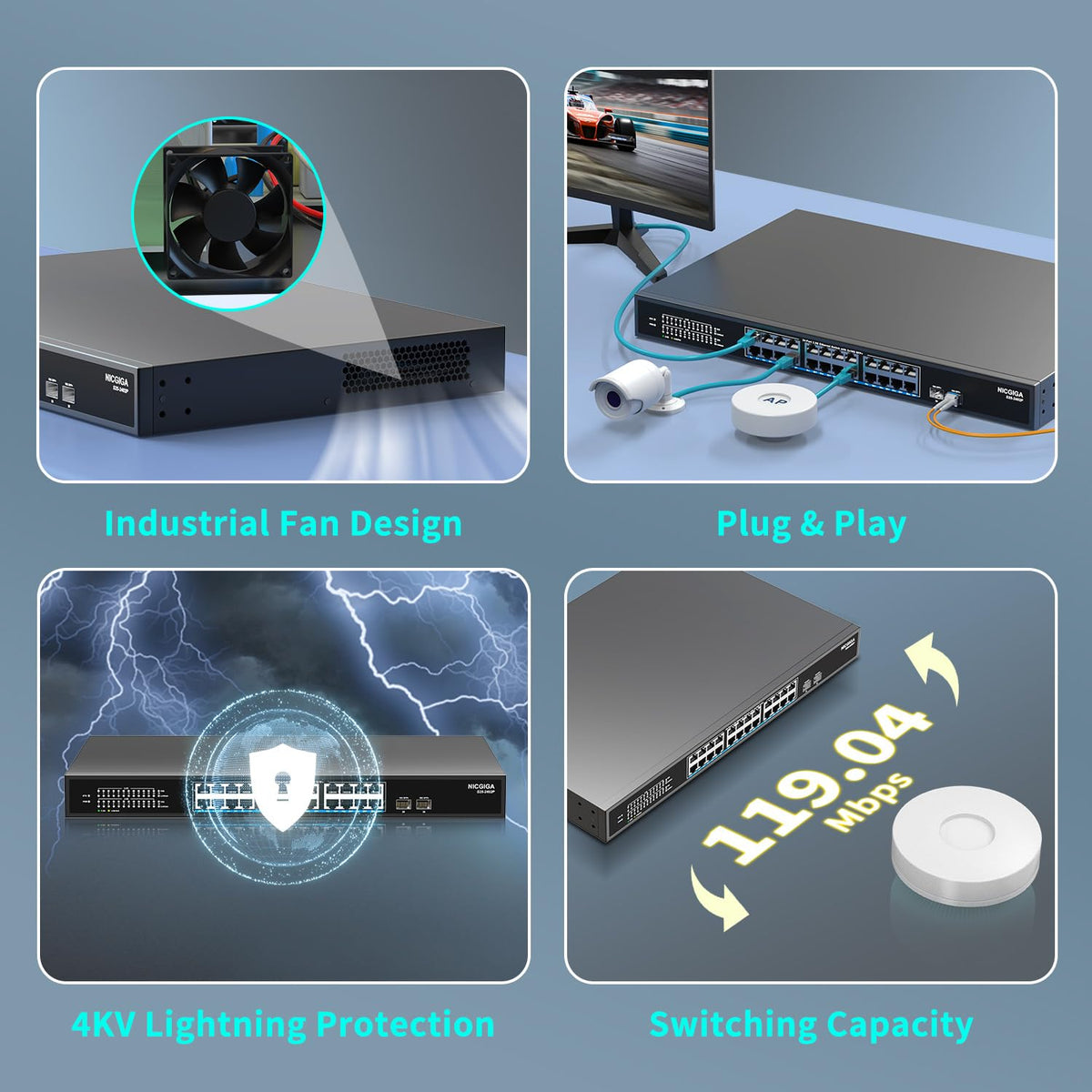 Q: What safety features does the switch include?A: The switch features a durable metal case with 6KV lightning protection, ensuring stable operation even in challenging environments. Its fanless design also contributes to quieter operation and energy efficiency.