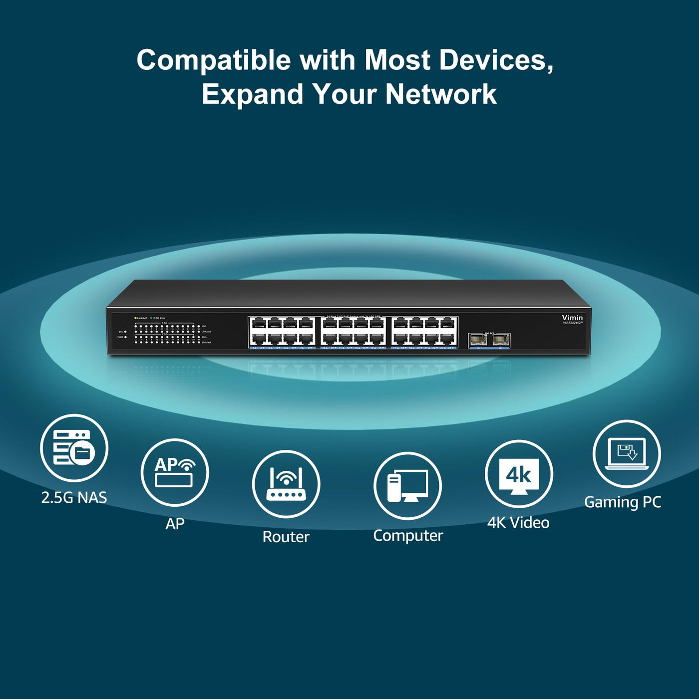 26-Port 2.5G Poe Switch Unmanaged, 24 2.5G Base-T Poe Ports, 2 10Gbps Sfp, 8 Port Poe Switch W/ 60Gbps Ethernet Switching Capacity, Support Ieee802.3Af/At, 65W, Vlan, Metal Housing, Fanless