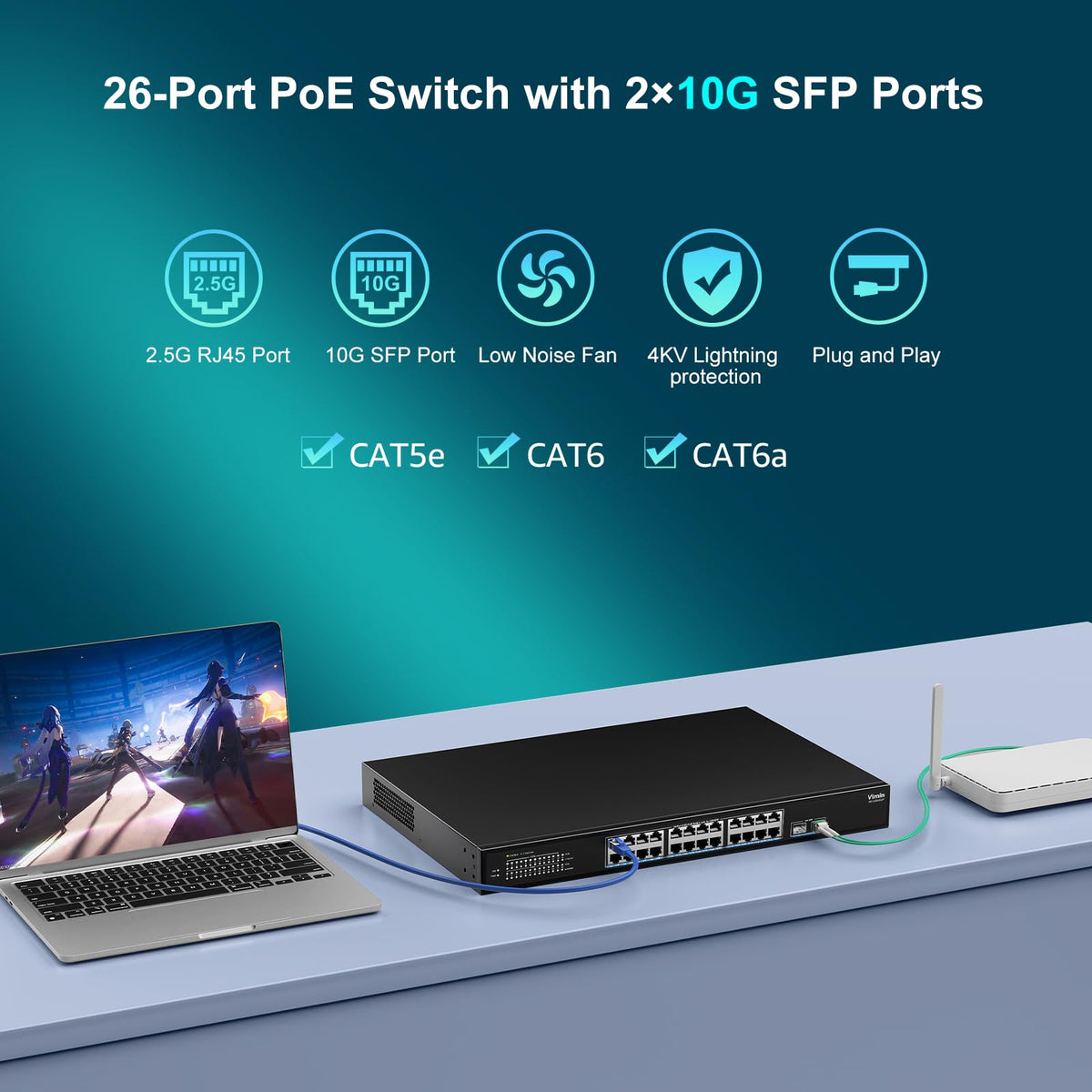 24 Port 2.5G Poe Switch With 2X10G Sfp, 24 2.5G Base T Poe Ports+10G Sfp, 26 Port Poe Switch Unmanaged 160Gbps Ethernet Switch