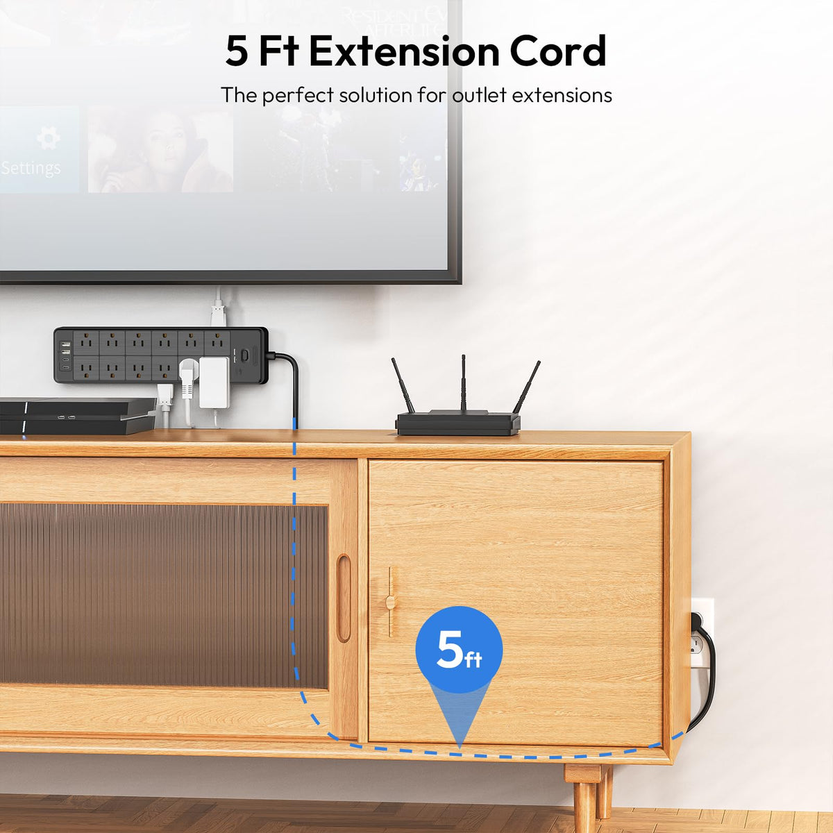 Q: Is this extension cord suitable for use behind furniture?A: Yes, the 0.53-inch flat plug design allows the 5 ft extension cord to be installed in tight spaces behind furniture, bookshelves, and tables without any obstruction.