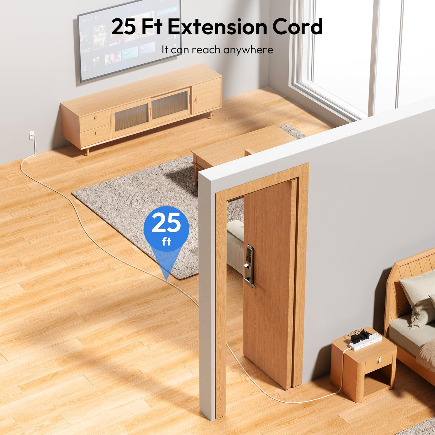 Q: How long is the extension cord and how does it help with placement?A: The extension cord is 25 feet long, providing flexibility to connect to distant outlets and hard-to-reach places, making it ideal for home and office setups.