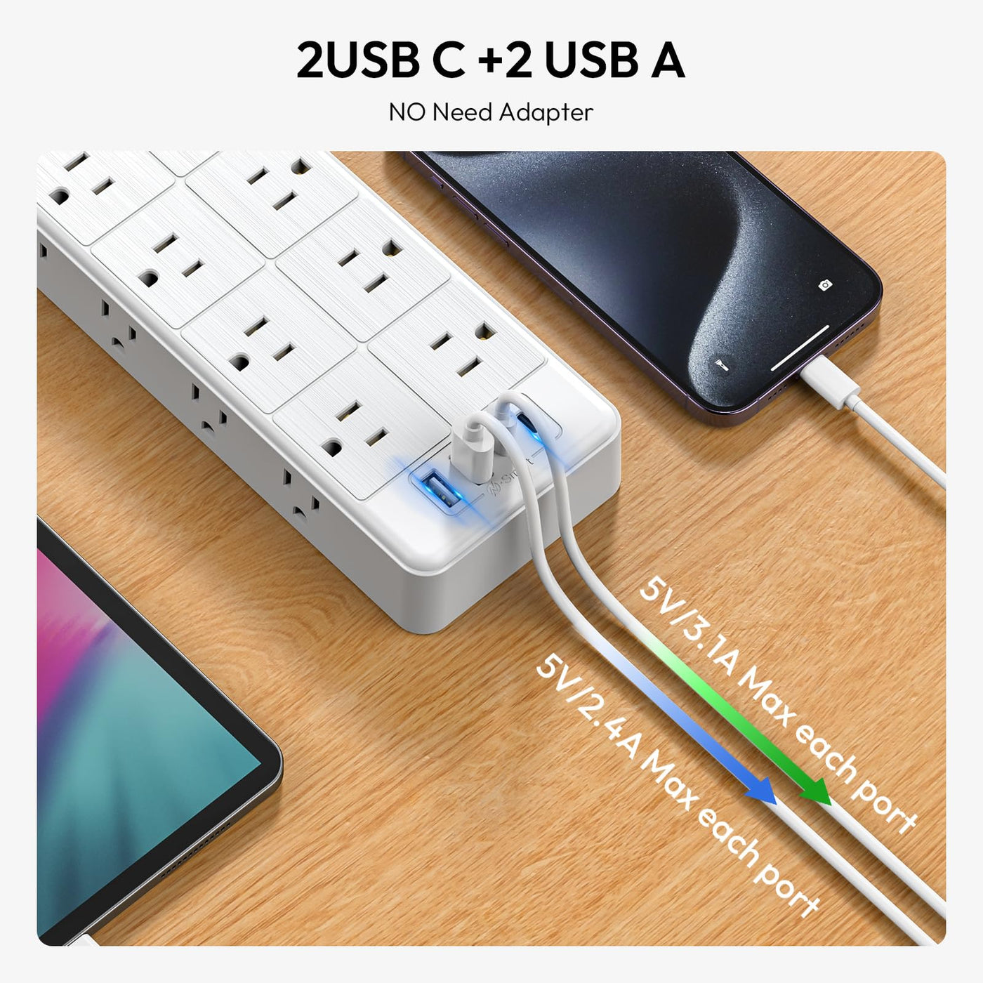 Q: Can I charge multiple devices at once with this power strip?A: Yes, the power strip includes 2 USB-C and 2 USB-A ports, allowing you to charge multiple devices simultaneously without the hassle of searching for adapters.
