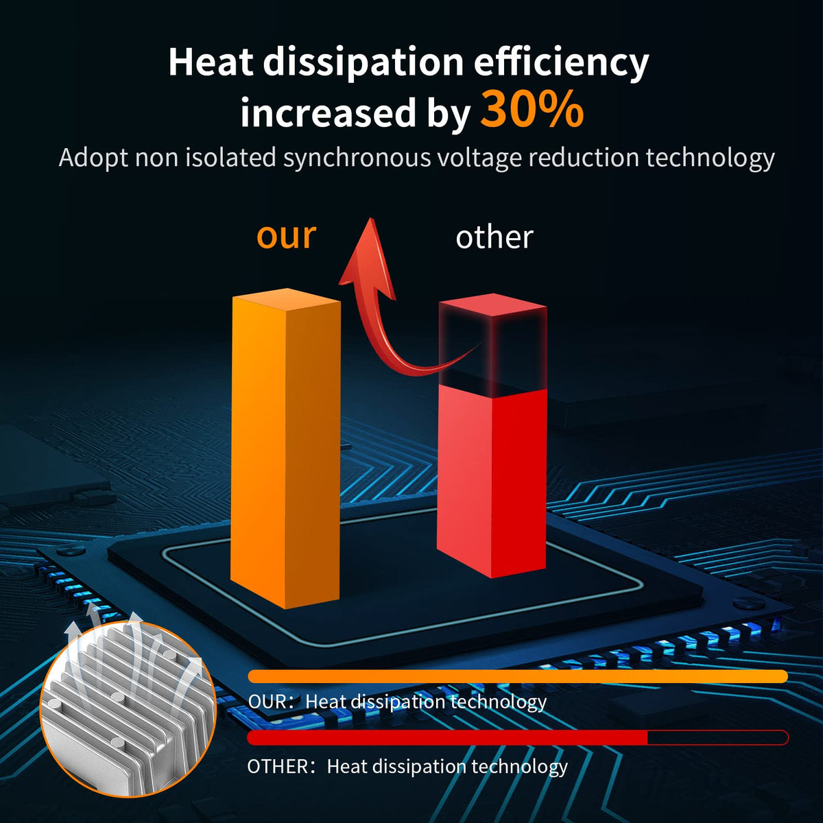 Q: What is the input voltage range for the 24V to 12V Converter?A: The 24V to 12V Converter operates within an input voltage range of 15V to 40V DC, making it suitable for various applications including heavy-duty trucks, cars, and solar systems.