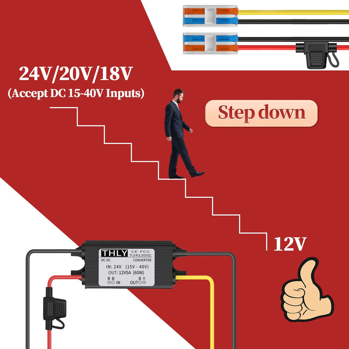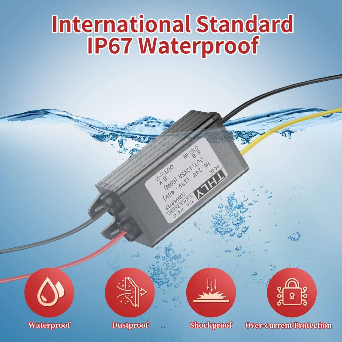 [24V To 12V Converter] This Dc-Dc Step Down Converter 24V To 12V Converts The Dc 24V Into Dc 12V. Low Power Consumption. Voltage Input: Dc 15-40V, Output: Dc 12V. Max Current: 5A 60W. Warning: 1.Please Test Whether The Output Voltage Is Correct Before Use; 2.Please Confirm The Positive And Negative Polarity Of The Power Before Wiring; 3.Must Hook The Negative Wire To Gnd Before Use, Or The Output Volts Will Not Change! | [With Fuse More Safer] For The Safety Of Devices, Our 18V To 12V Step Down Converter Are Equipped With Fuses. When The Current Is Too High, The Circuit Breaks Down Or Abnormal, The Fuse Will Blow And The Transformer Will Stop Working, Thereby Protecting The Electrical Appliances. In Addition, This Can Reduce The Risk Of Fire Or Explosion. High Conversion Rate Over 96%, Output Correctly. High Quality And Performance More Durable, Longer Service Life. | [Ip67 Waterproof] This Dc To Dc Converter Adopted Heat Conduction Organic Silica Gel Filling And Sealing Technology, Waterproof, Anti-Shock, Anti-Humidity And Dust-Proof. Which Make It Can Be Used Outdoors With Standing Heavy Rains Or Bad Weathers. It Is Widely Used On Golf Cart, Led Strip Light, Bus, Car Truck Vehicle, Motor, Gps, Bus Display, Taxi Advertising Screen, Car Audio, Lcd Tv, Intercom And Monitoring System Etc. | [Wire Terminal Block Easy To Install] This 18V To 12V Step Down Comes With Quick Release Terminals Which Is Very Easy To Install. The 24V To 12V Converter Is Equipped With Quick Cable Connectors For Quick Connection. You Can Save A Lot Of Trouble Without Taping Wires. Note: Strip The Wire 0.4'' (10Mm Or So) And Insert It Into The Connector. | [Best Service] Our Company Provide 12 Months Warranty. If The 24V To 12V Converter Has Any Problems, Please Feel Free To Contact Us For Replacement Or 100% Money Back. We Always Stand Behind The Products.