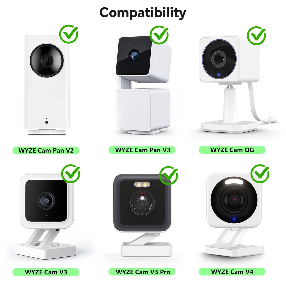 Q: Is this power adapter compatible with all WYZE camera models?A: This power adapter is specifically designed for compatibility with WYZE Cam Pan V3, WYZE Cam Pan V2, WYZE Cam V4, WYZE Cam OG, and WYZE Cam V3/V3 Pro. Please note that the camera itself is not included.