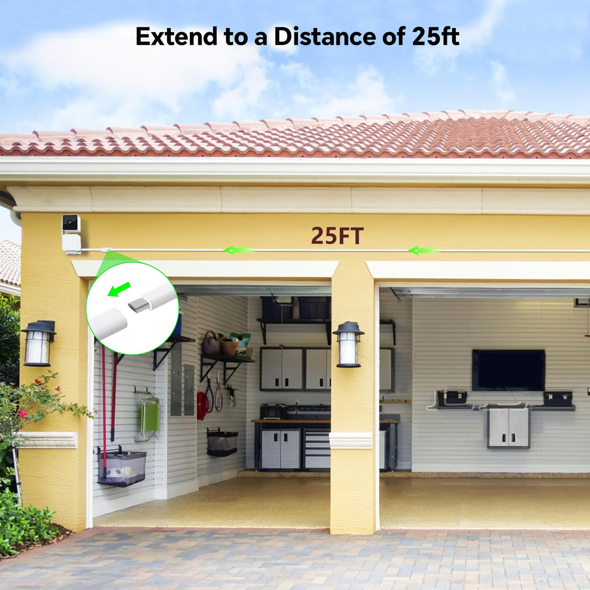 Q: What is the length of the power cable and how does it benefit outdoor use?A: The power cable is 25 feet long, providing ample length to position your camera in various outdoor locations while ensuring a continuous power supply. Its flat design allows it to fit through tight spaces like doors and windows for seamless installation.
