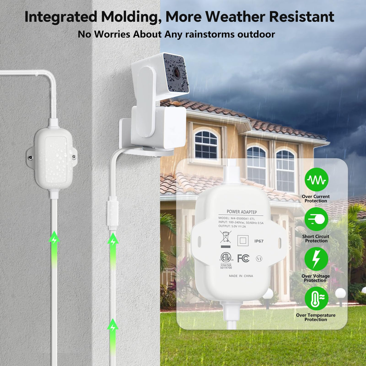 Q: How weather-resistant is this power adapter and cable for outdoor use?A: The power adapter and cable are built to withstand harsh weather conditions, ensuring reliable performance rain or shine. It is designed for extreme cold environments, making it suitable for outdoor surveillance year-round.