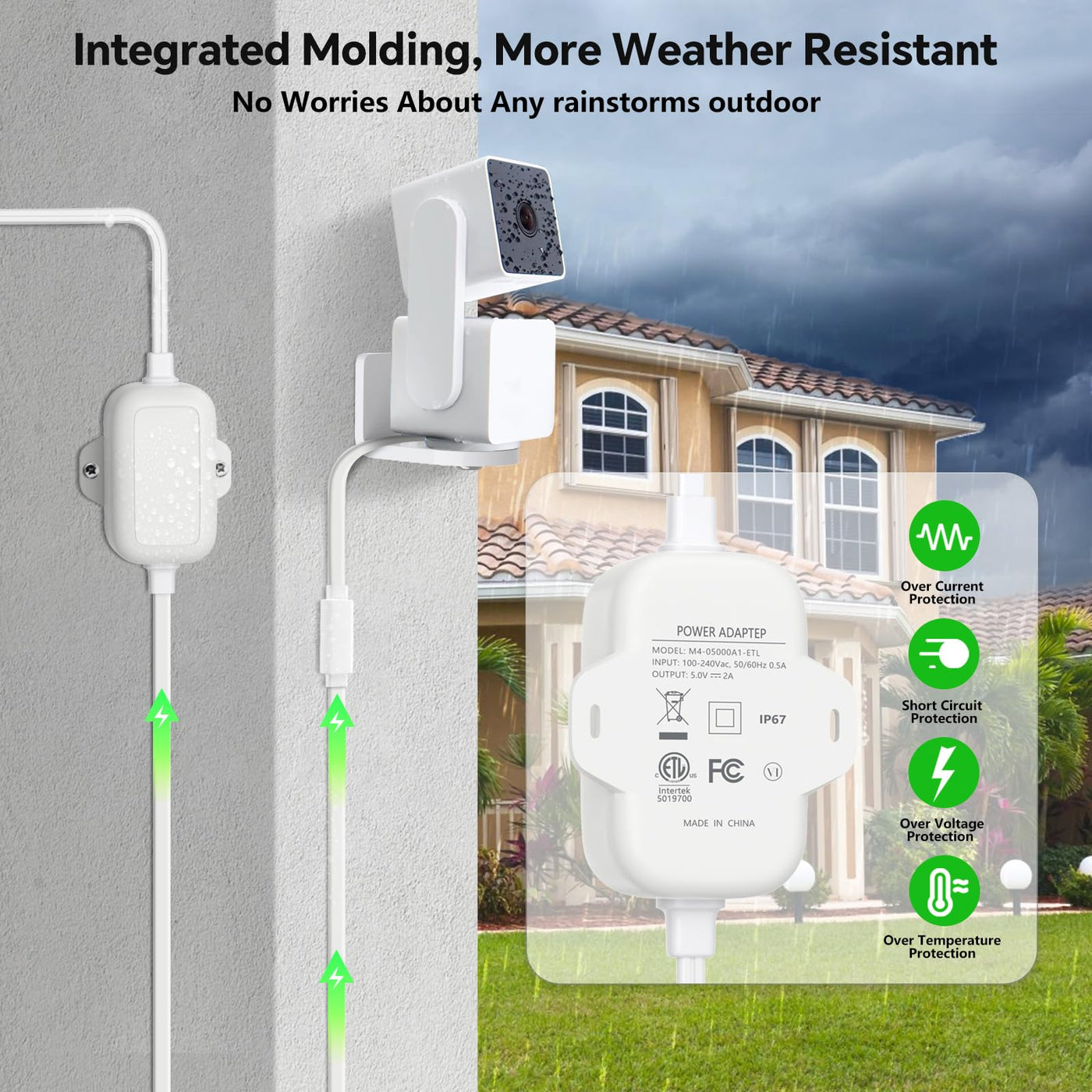 Q: Does this product offer any safety features to protect my WYZE camera?A: Yes, the power adapter is UL certified, which means it meets safety standards for preventing damage during charging. It includes built-in safety features like over-current, overheating, over-voltage, and short-circuit protection.