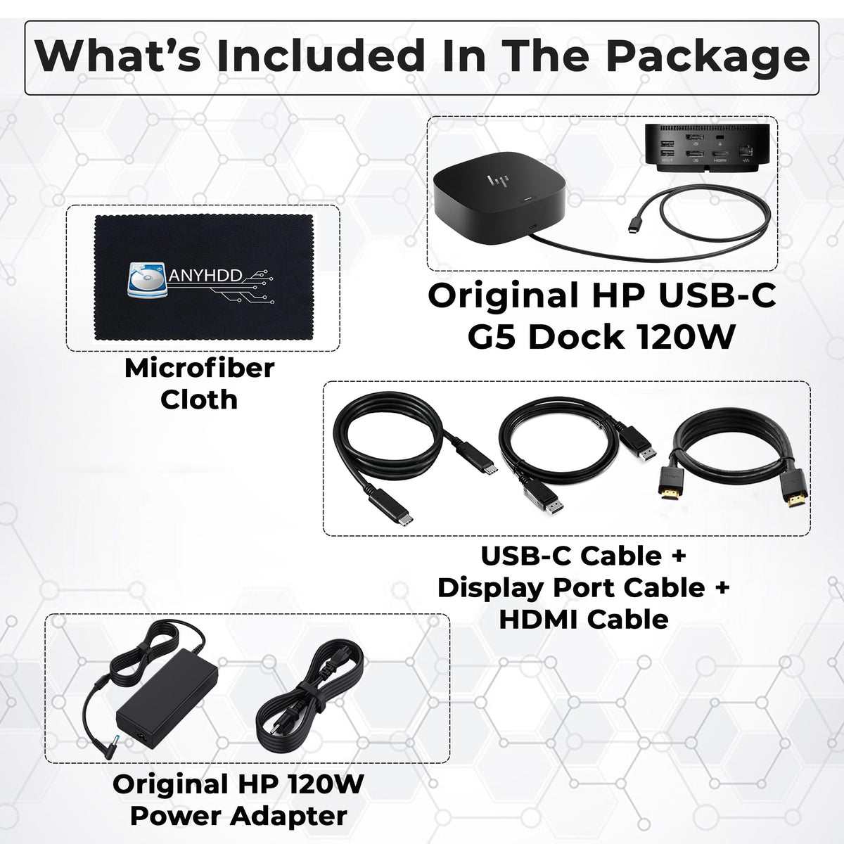 Q: What is included in the HP Docking Station package?A: The package includes the HP Dock 26D32AA#ABL, a Power Adapter, an HDMI Cable, a DisplayPort Cable, a USB-C Cable, and a Microfiber Cleaning Cloth for maintenance.