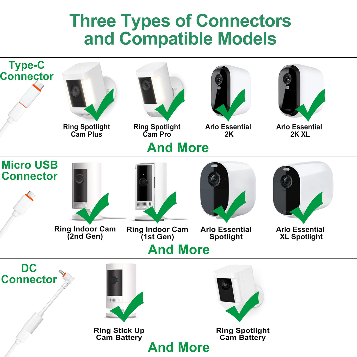 Ayiifei Power Extension Cord With Adapter, Compatible With All Ring Cameras,All Blink Cameras And Eufy Security Cameras, Weatherproof Charging Cable Plus Charger. Compatibility: Ring Camera: Ring Spotlight Cam Pro, Battery Ring Spotlight Cam Plus, Battery Ring Spotlight Cam Battery Ring Stick Up Cam Battery Ring Indoor Cam Simpliisafe Outdoor Camera Blink Camera: Blink Outdoor 4 (4Th Gen) Camera Blink Outdoor (3Rd Gen) Camera/Xt/Xt 2 Eufycam: Eufycam 3C Eufycam 2/2C/2 Pro/2C Pro/E Eufycam Solocam E20/Solocam E40 Product Advantages: This Cable Is Exceptionally Slim, Measuring Just 0.07 Inches In Thickness, Allowing It To Pass Through The Narrow Gapes Of Doors And Windows Effortlessly. With Gold-Plated Usb Connector Pins, This Product Offers Enhanced Durability, Longer Lifespan, And More Important, It Meets American Wire Gauge Standards. Package Include: 2 X 26Ft Extension Cable 2 X Dc 5V1A Adapter 12 X Cable Nails 10 X Adhesive Cable Clips&Nbsp; Reminder: This Package Does Not Include Any Cameras.&Nbsp; Please Note That This Power Cord Is Intended As A Replacement For An Existing Short Cord, Not As An Extension. Choose The Length Carefully To Meet Your Needs. Worry-Free Service: If You Encounter Any Issues, Please Contact Us, And We Will Resolve Your Concerns Promptly And Effectively.