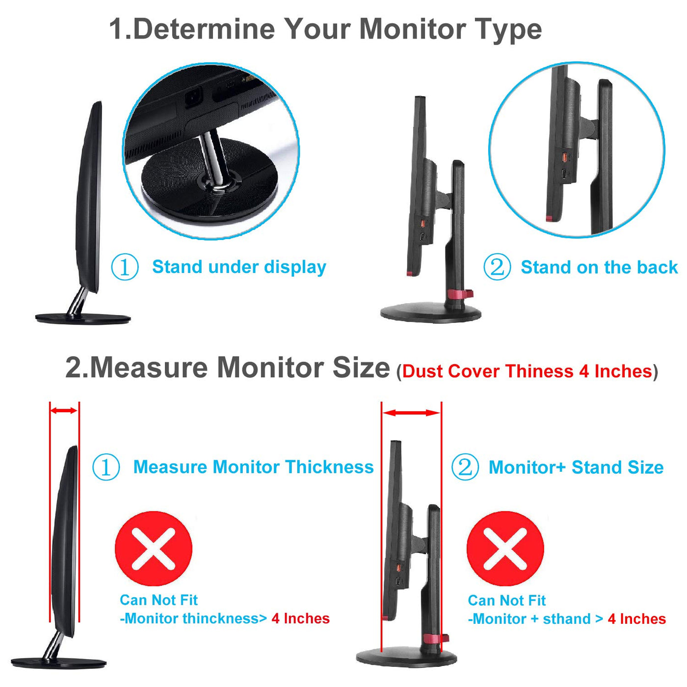 Q: How do I ensure the dust cover fits my monitor properly?A: To ensure a proper fit, measure your monitor's height and width in inches, including any stand. The thickness of the monitor plus the stand should not exceed 4 inches. Select the appropriate size based on these measurements.