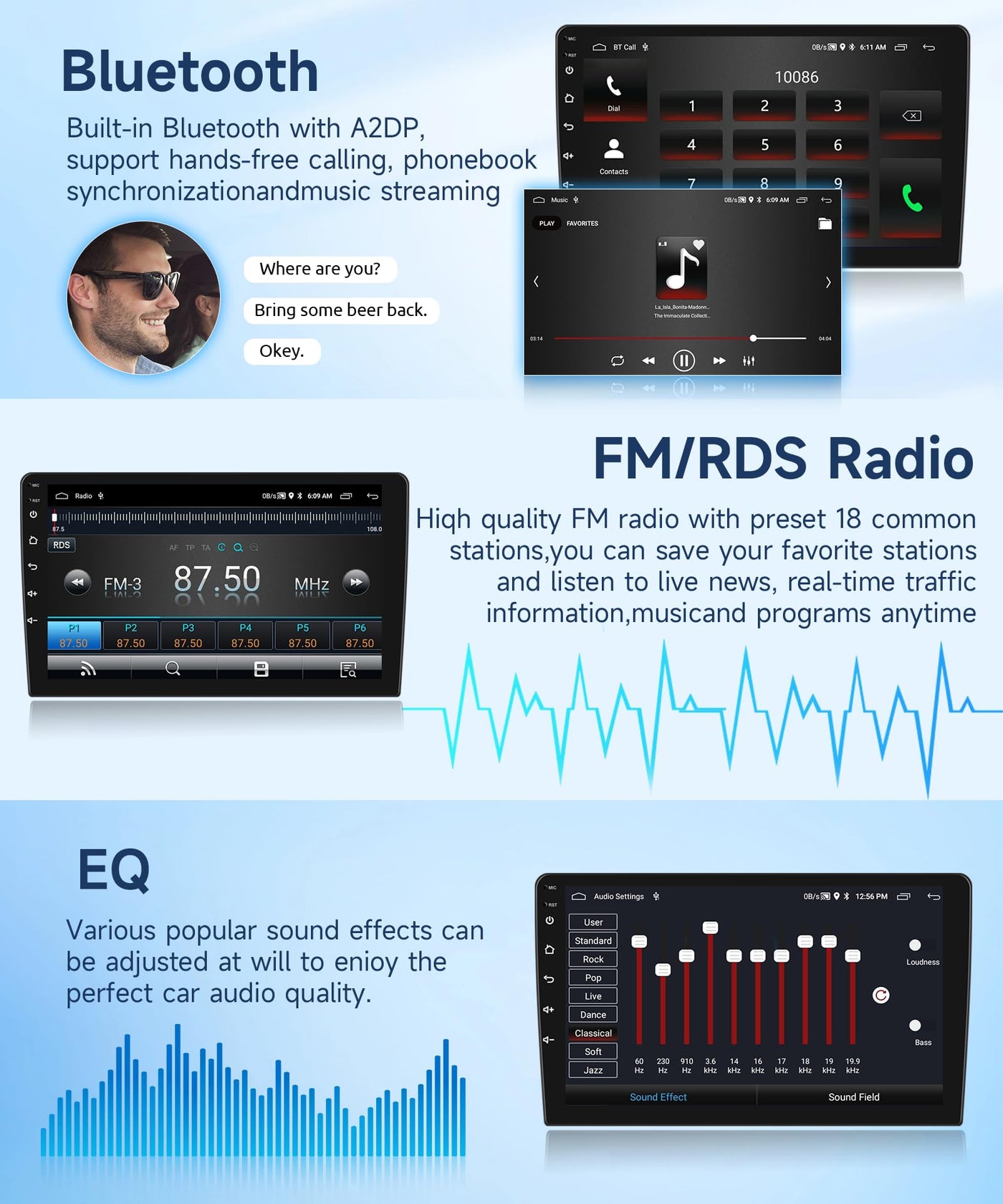 Compatible Vehicles: For Toyota Corolla 2009 2010 2011 2012 2013 Features: ?Hd 9'' 2.5D Tempered Glass Mirror Auto Radio Player ?Wireless Carplay: You Can Choose Wired Connection Or Wireless Connection To Carplay, Connect To Apple Mobile Phone, Access Mobile Phone Address Book, Mail, Notification, Map Navigation, Music, Video And Other Information, And Realize Voice Control. ? Wireless Android Auto: The Wireless Android Auto Car System Can Closely Integrate The User'S Android Phone And Player, And Realize Navigation, Make Calls, Send And Receive Information, Listen To Music And Other Operations Through Data Cable Connection. ?Built-In Gps Navigation: With Wifi Connected, Online Maps Can Be Used Perfectly, You Can Go Anywhere You Want And Never Get Lost Again. ?High Definition 1080P: Full Capacitance Touch Screen For Easy Operation, Well Designed User Interface For Car Only ?Rear Camera: Support Ahd High-Definition 720P Camera Image Input,You Can Switch Between Cvbs And Ahd Simply By Choosing In The Settings(Included) ?Steering Wheel Control: Through It You Can Control The Functions You Need By Steering Wheel, More Convenient ?Built-In Bluetooth With A2Dp/Hands Free/Phone Book:Bluetooth Hands-Free Calls,Bluetooth Music Player,Auto Loading Phonebooks ?Fm Radio: Online Music You Can Transfer The Music To The Car Stereo By Fm To Enjoy The Original Car Stereo Sound,With 18 Preset Stations ?Time Setting:You Can Use The Network Or Gps To Open The Date And Time Automatically, Or You Can Adjust It Manually. ?Support External Microphone Specifications: System:Android Screen Size:9'' Memory:2Gb (Ram)+64Gb (Rom) Screen Resolution:1024*600 Power Output:4*45W Radio Band:Fm/Rds Video Output:Support External Microphone: Support Split Screen: Support Usb:Double Usb Interface Factory Setting Keyword:1234