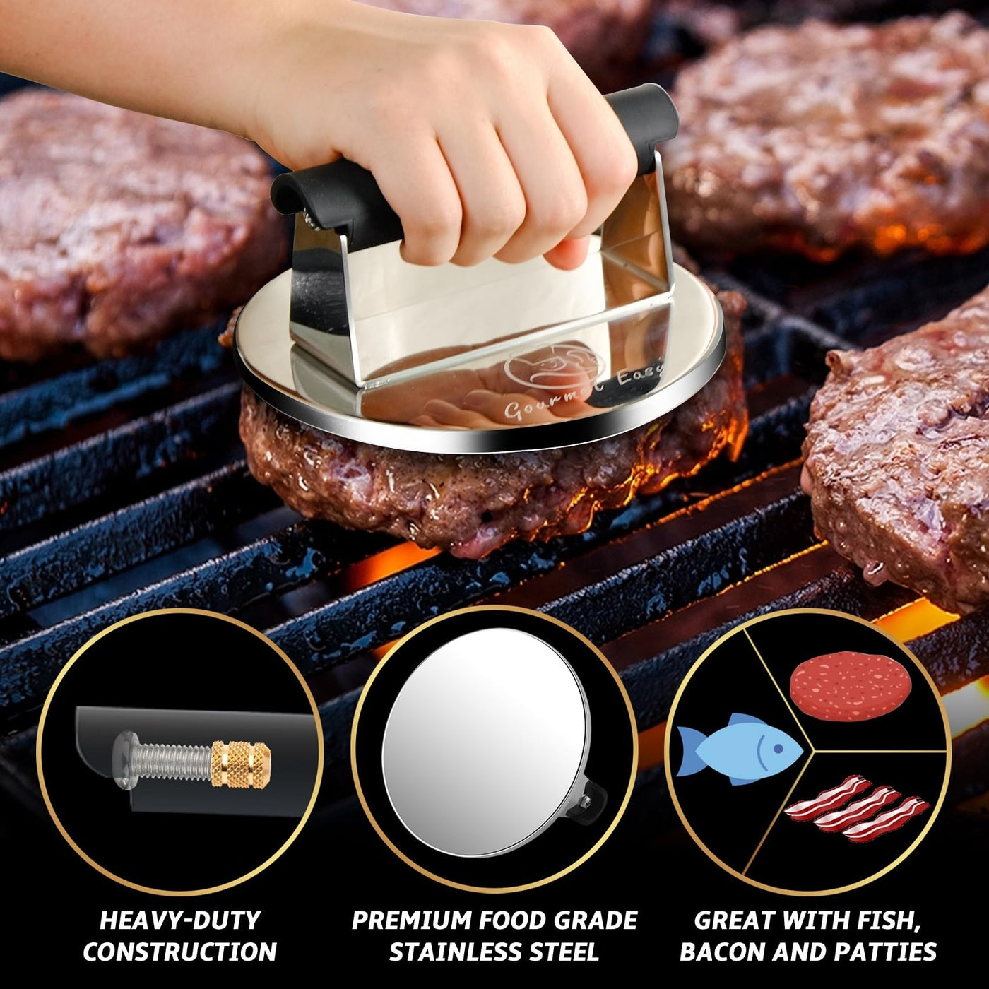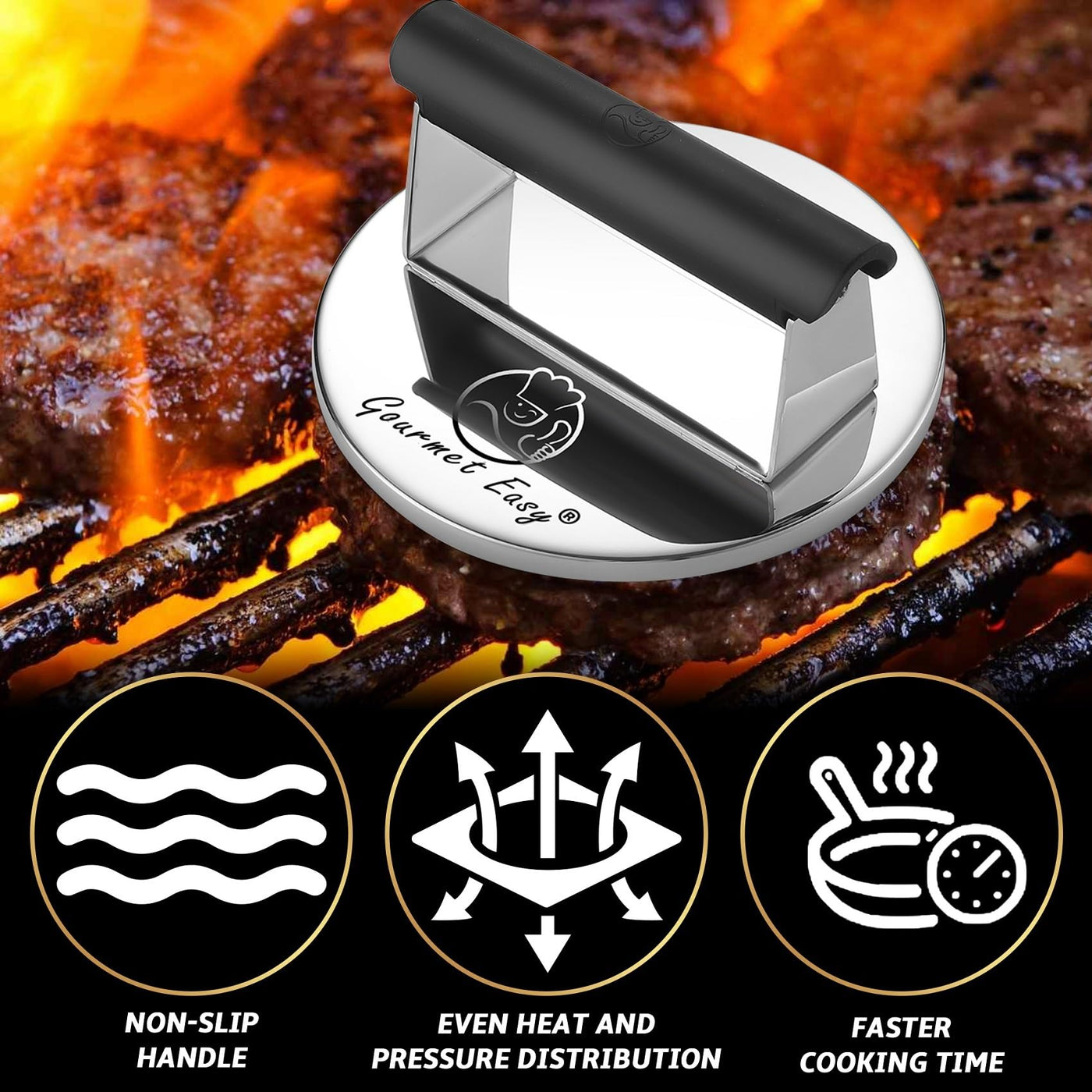 Lets Get This Patty Started! Introducing Gourmet Easy Hamburger Meat Smasher - The Ultimate Cooking Tool For Making Perfectly Shaped, Restaurant Quality Burgers Right In Your Home. Whether You'Re A Seasoned Chef Or A Weekend Warrior At The Grill, This Premium Meat Press For Cooking Will Take Your Burger-Making Skills To The Next Level! The Best Thing About Our Grill Weight Is That It Will Never Rust! This Burger Press Is Made Of 304 Stainless Steel And Is Designed To Withstand The Stresses Of Your Grilling Work. Its Tough And Compact Design Provides Long-Lasting Performance, Making It A Reliable Cooking Gadget For Endless Cookouts. Our Meat Weight Also Has A Heat-Resistant Grip That Allows You To Easily Apply Pressure To Your Burger Even While It'S Sizzling Hot On The Grill. This Amazing Burger Weight With Smooth Flat Surface Will Not Only Help You Achieve Those Crispy-Edged And Juicy Patties, But It Will Also Help You Cook Your Burgers Or Bacon Into A Healthier Way. By Smashing The Meat, Our Flat Grill Press Removes All Unwanted Oils And Fats From Your Food Making It Less Fat But More Flavorful! Our Cooking Press Is Also Easy To Clean. Just Rinse Under Running Water And Wipe Dry. It Is Also Dishwasher Safe, Spend Less Time Scrubbing And More Time Enjoying Your Delicious Burgers. Don'T Settle For Ordinary And Boring Burgers. Get Our Incredible Hamburger Press For Grill Now And Create Extraordinary Burgers - Juicy To The Last Bite! This Is A Game Changer. Try It Now!