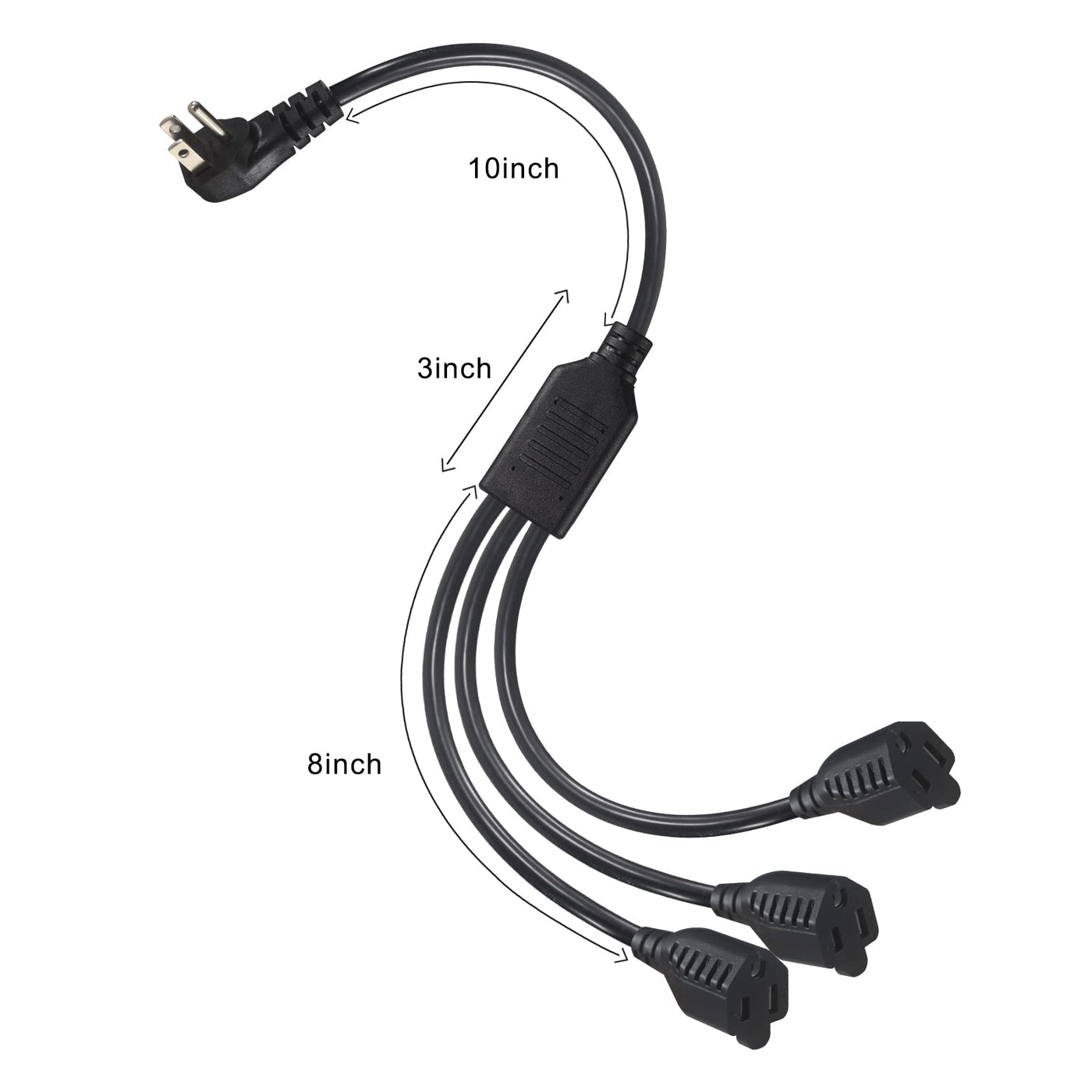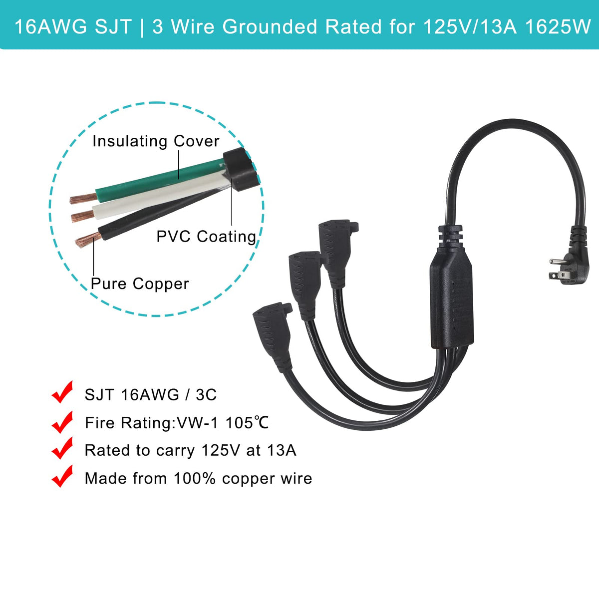 Q: Is this extension cord suitable for high wattage appliances like microwaves or freezers?A: Absolutely! The 1.5FT 3 Outlet Power Splitter can handle high wattage appliances like microwaves and freezers, given its 1625W power capacity. Just ensure that the total wattage of all connected devices does not exceed this limit.