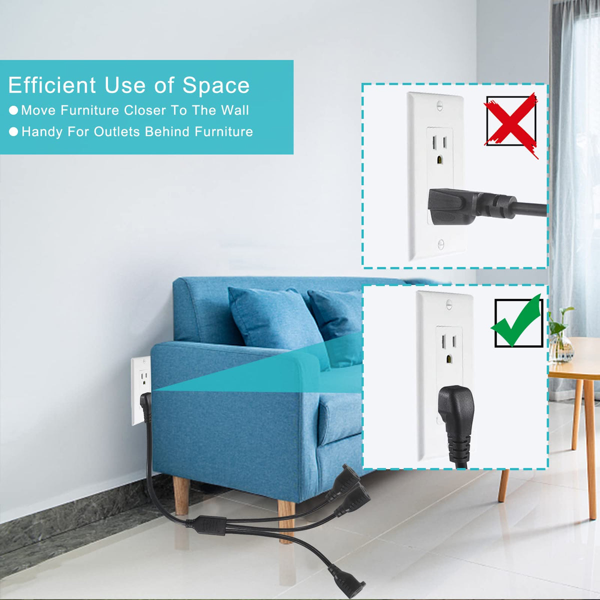 Q: How does the 90° angled flat plug benefit my setup?A: The 90° angled flat plug design allows you to place your appliances and furniture closer to the wall without damaging the plug. This is especially useful in tight spaces where traditional plugs would be cumbersome.