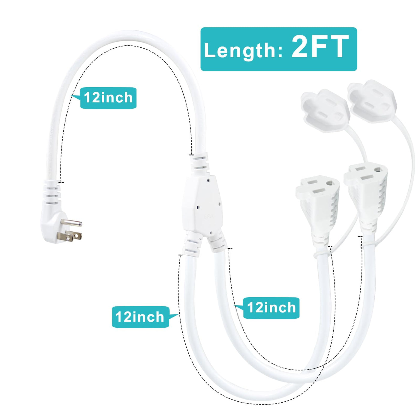 [2Pack] 2 Way Outdoor Extension Cord Splitter White 2Ft 1 To 2 Splitter Extension Cord, 125V 13 Amp 16Awg 2 Way Waterproof 90