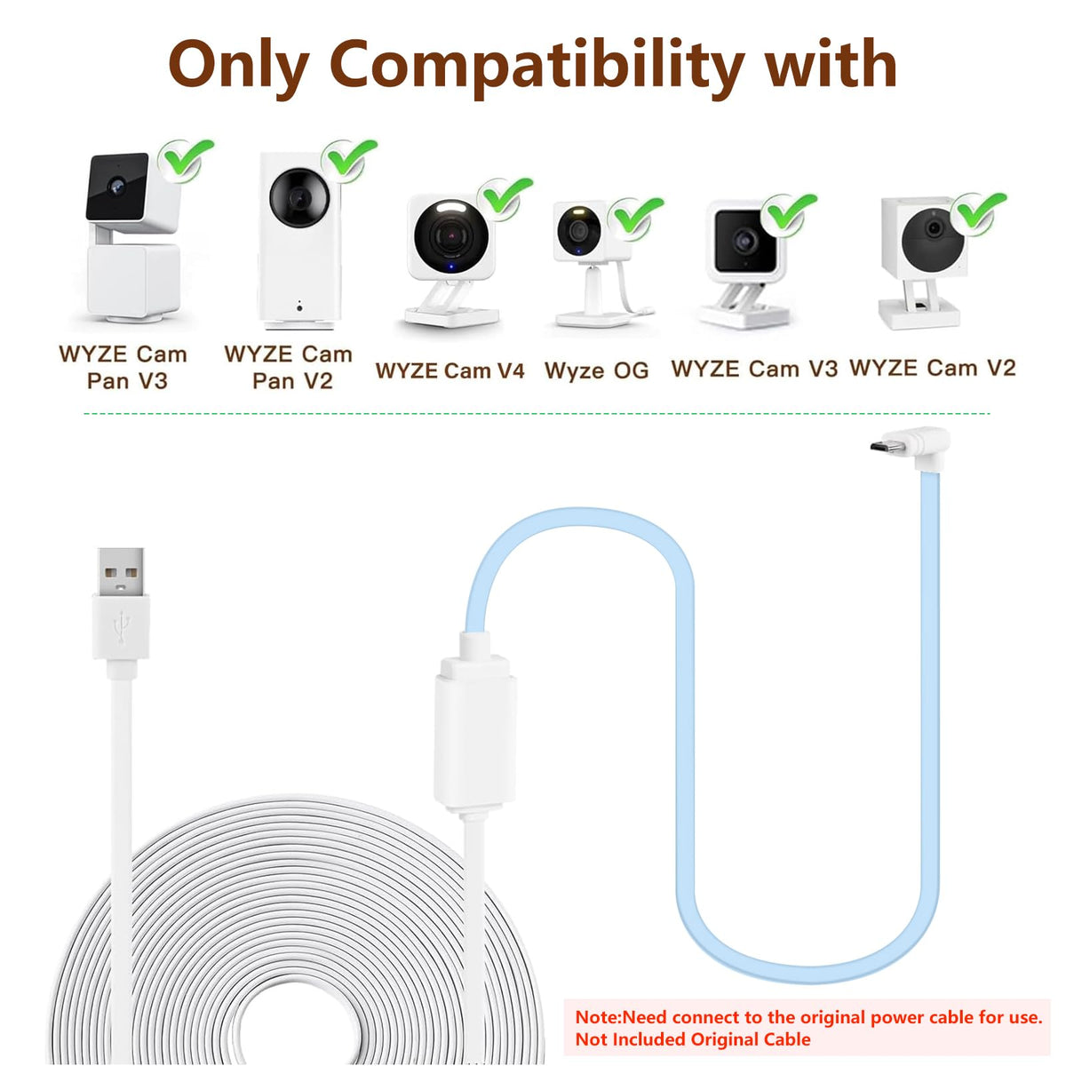 Q: Is the 2Pack 25ft USB Extension Cable compatible with all WYZE camera models?A: The 2Pack 25ft USB Extension Cable is specifically designed for compatibility with WYZE Cam Pan V3, V2, WYZE Cam OG, WYZE Cam V4, and other WYZE camera models. Please note that the cable is sold separately, and cameras are not included.