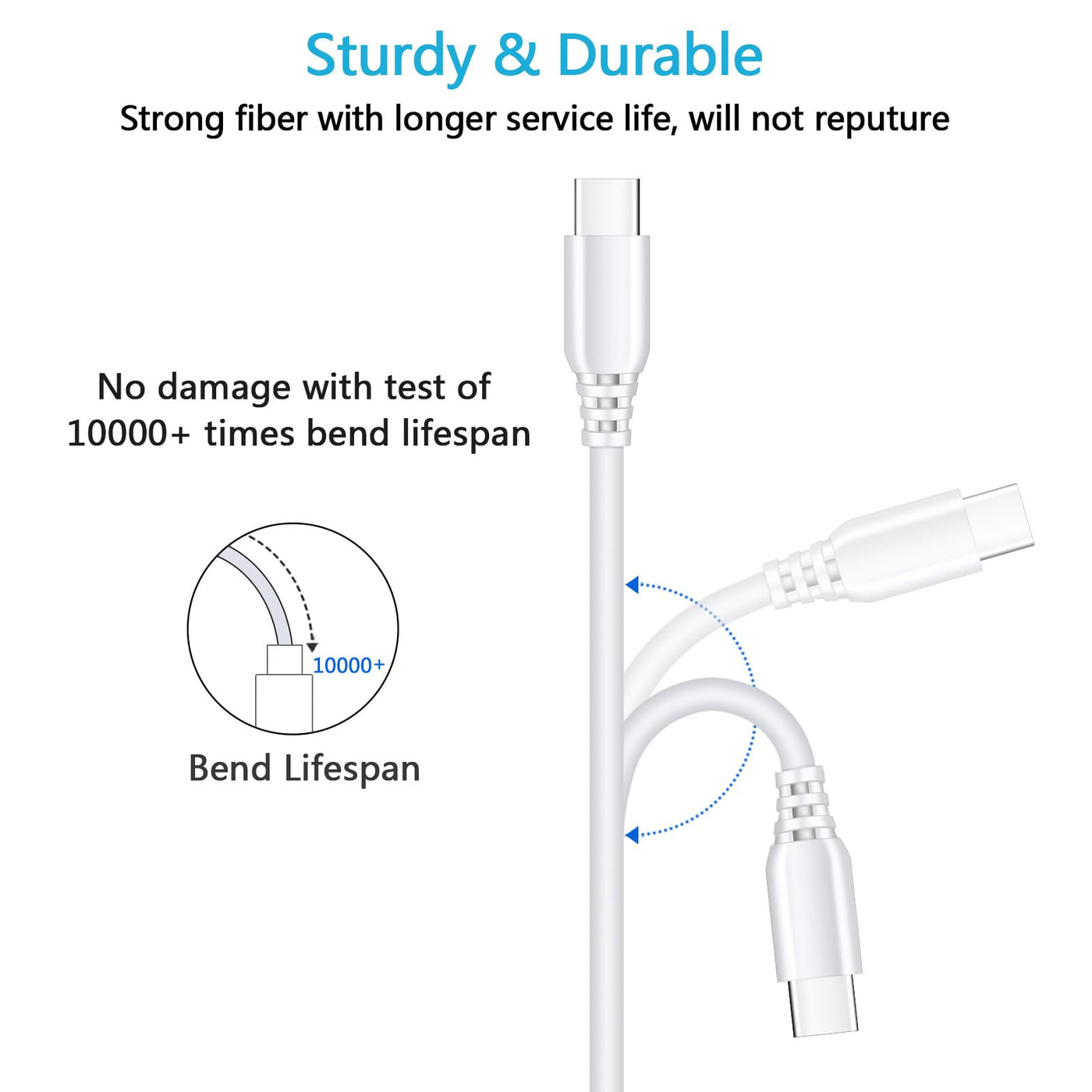- Q: How durable is the 2Pack Super Fast Charging Cable? A: This cable is built for high durability with a thick tinned copper core, premium aluminum housing, and a soft touch material jacket. It has a bend lifespan of over 6000 times, making it resistant to kinking and pulling.