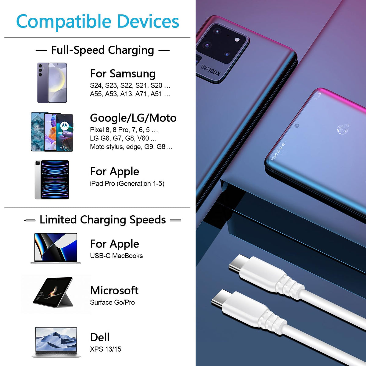 - Q: What devices are compatible with the 2Pack (3ft, 6ft) Super Fast Charging Cable? A: This USB C to C charging cable is compatible with a wide range of devices including Google Pixel 9 series, Samsung Galaxy S24/S23/S22/S21 and Note series, as well as various Motorola and LG models. It also works with tablets, power banks, earphones, and other devices that feature a USB Type-C charging port.