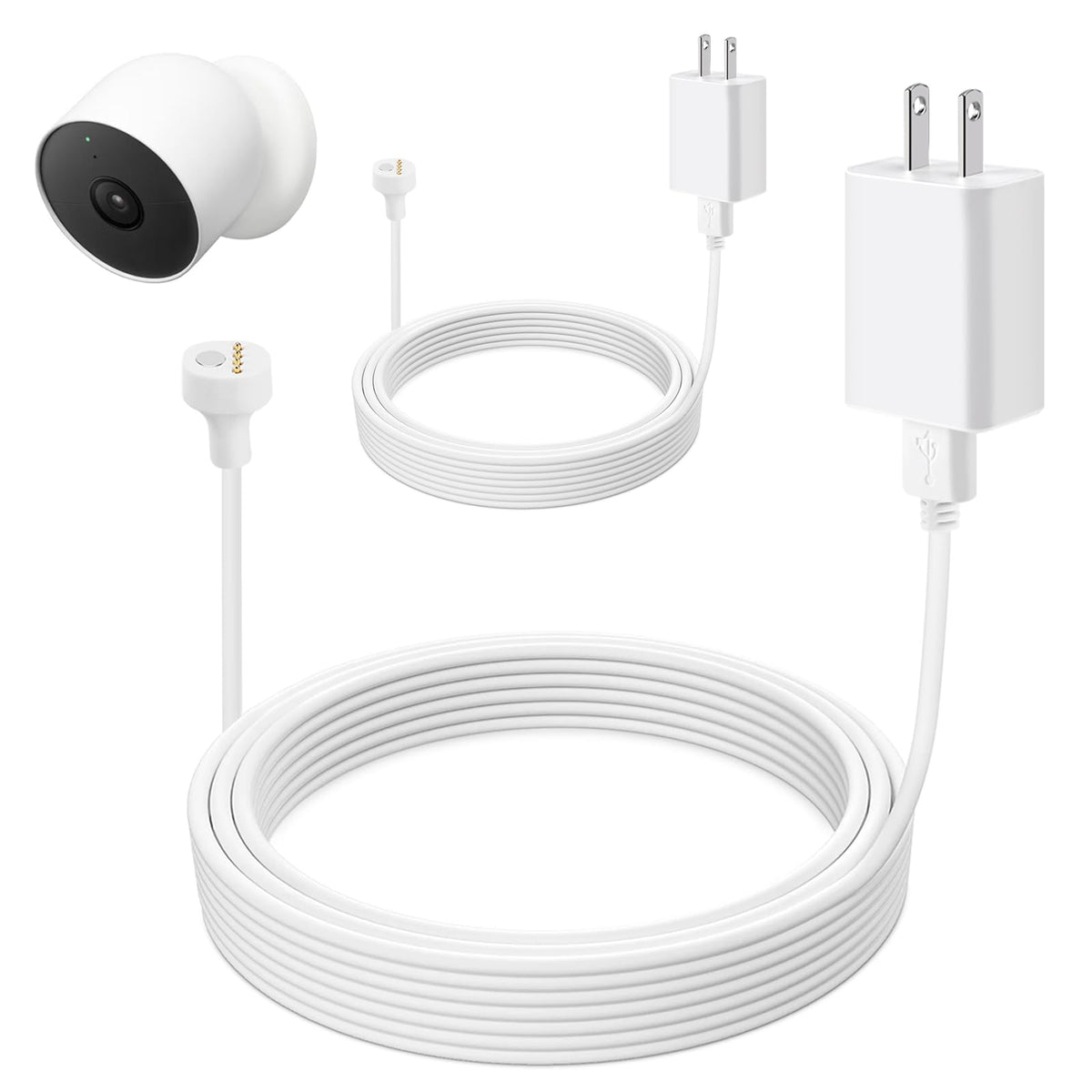 Q: What items are included in the package when I purchase this power cable?A: The package includes 2 power adapters, 2 16FT/5M charger cables, 2 packs of Circle cable clips with steel nails, and 2 packs of plastic cable clips for easy installation.