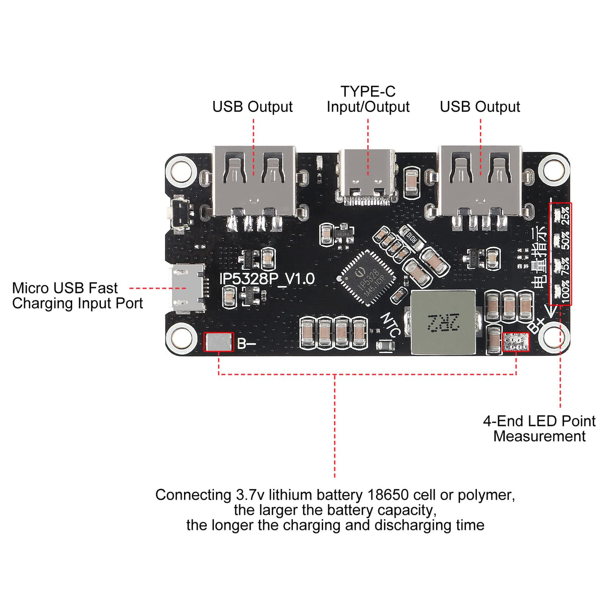 Q: Is the IP5328P compatible with all types of 18650 batteries?A: Yes, the IP5328P is compatible with single-section or parallel 18650 batteries of various capacities. However, it is recommended to use a battery safety protection board to prevent reverse polarity issues.
