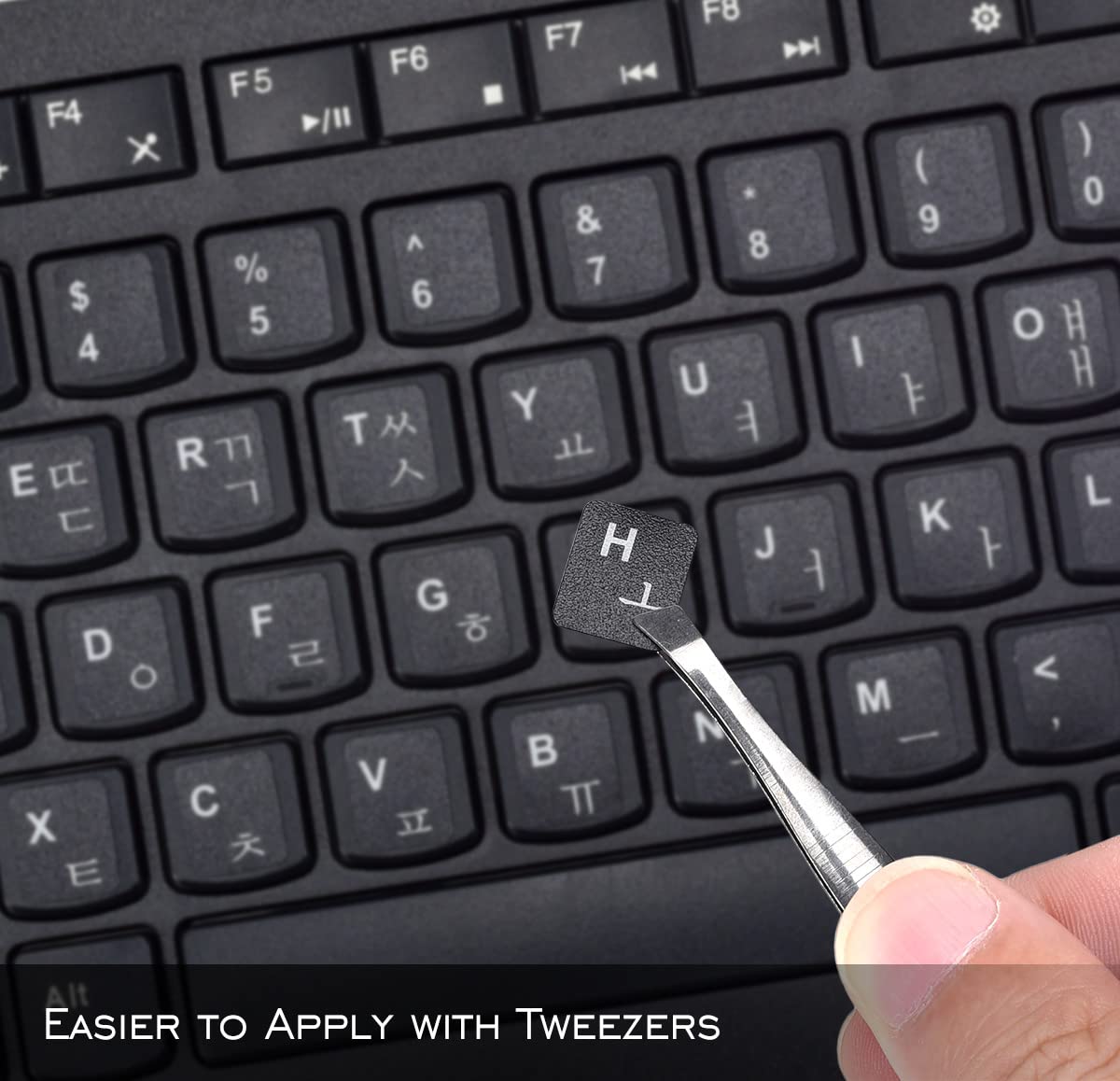 This Keyboard Stickers Are Compatible With A Variety Of Computer Notebook Laptop Desktop Keyboards, Such As Apple Macbook Imac, Hp, Dell, Ibm, Logitech, Toshiba, Sony And So On Laptop Keyboard(Just Make Sure The Keys Size Larger Than The Sticker Size: 0.51'' X 0.43'' (11Mm X 13Mm))Multi-Language Keyboard Stickers:- English Keyboard Stickers(Black Background)- English Keyboard Stickers(Purple Background)- Hebrew-English Keyboard Stickers- Korean-English Keyboard Stickers(Black Background)- Korean-English Keyboard Stickers(Purple Background)- Russian-English Keyboard Stickers(Black Background)- Russian-English Keyboard Stickers(Purple Background)Product Size:Full Size: 7.09'' X 2.56'' (180Mm X 65Mm)Each Units Size: 0.51'' X 0.43'' (11Mm X 13Mm)Operation Steps: Wipe Off The Dust On The Keyboard With A Cleaning Cloth Before Stick, Then Use Tweezers To Peel The Keyboard Sticker, Stick It On The Corresponding Key, And Then Press Hard Several Times To Make It Fully Bonded.Package Contain:2Pcs X Korean Keyboard Stickers1X Tweezer