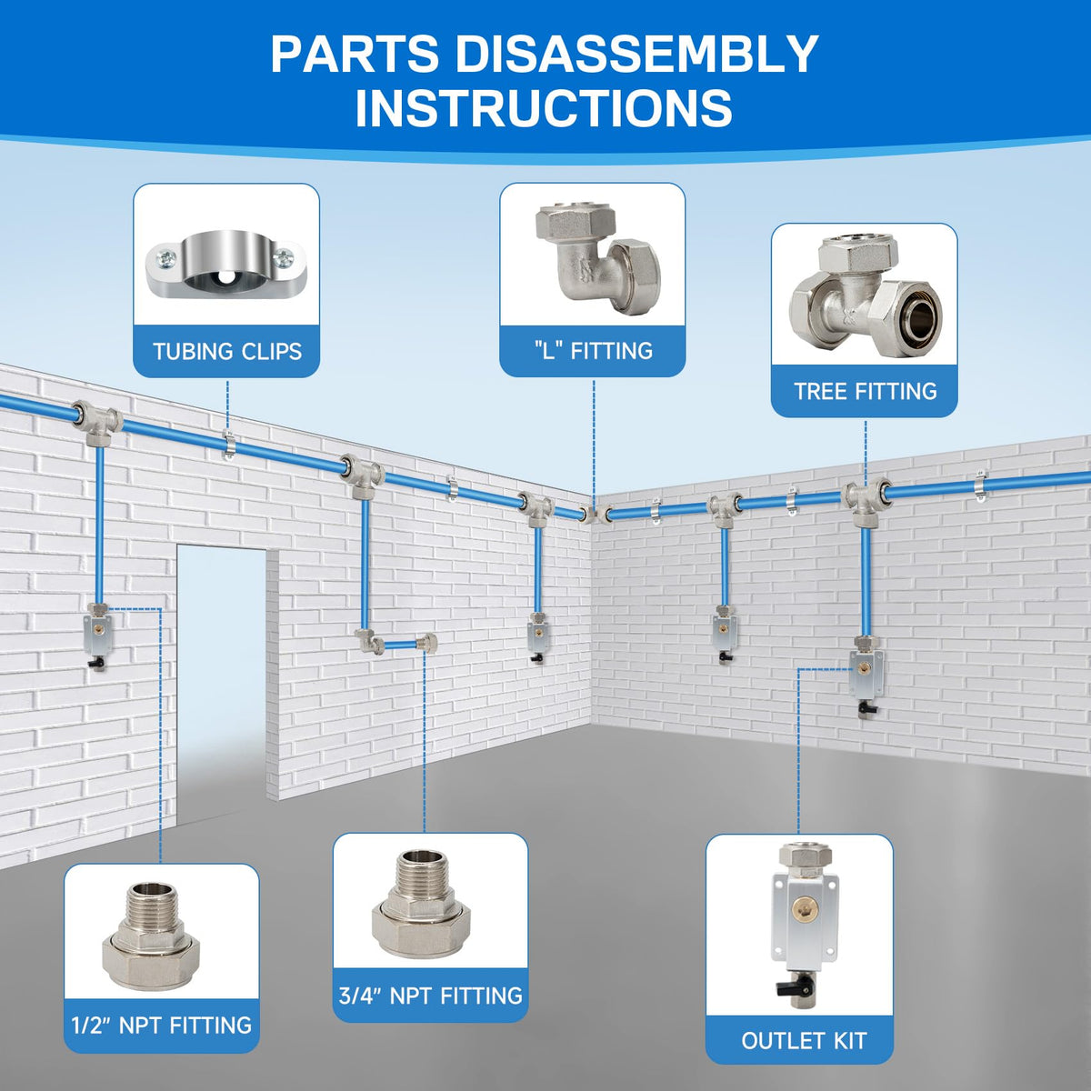 Air Line Kit Products Include : 300 Ft Hdpe Tubing*1 3/4 Tubing Tee Fittings*4 3/4Lfittings*5 3/4 Npt Fittings*1 1/2 Npt Fittings*5 3/8 Npt Drain Valves*5 4Way Aluminum Blocks*5 Tubing Clips*40 Screws*1Pack Bevel Tool*1 Cutter*1 Protective Gloves*1