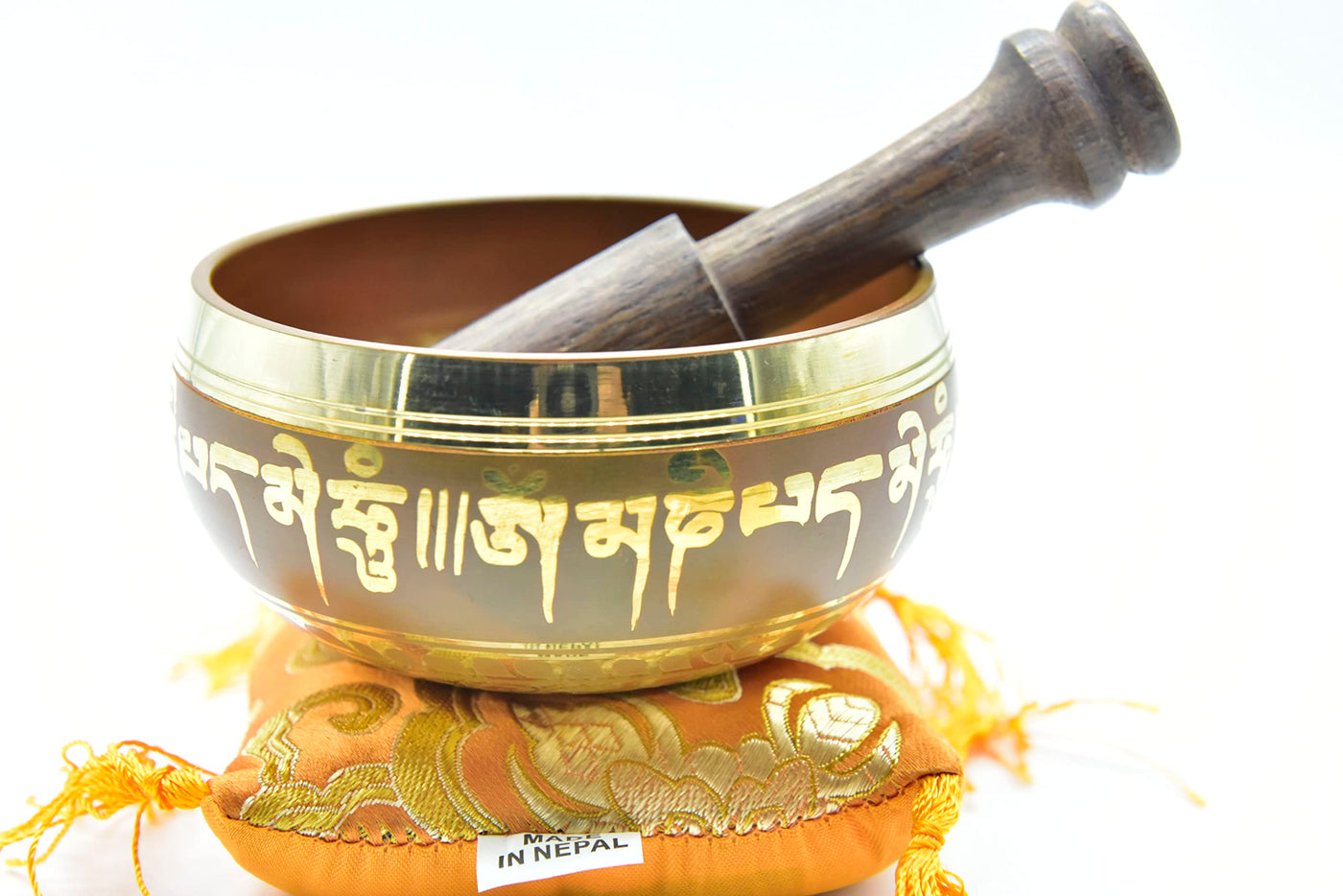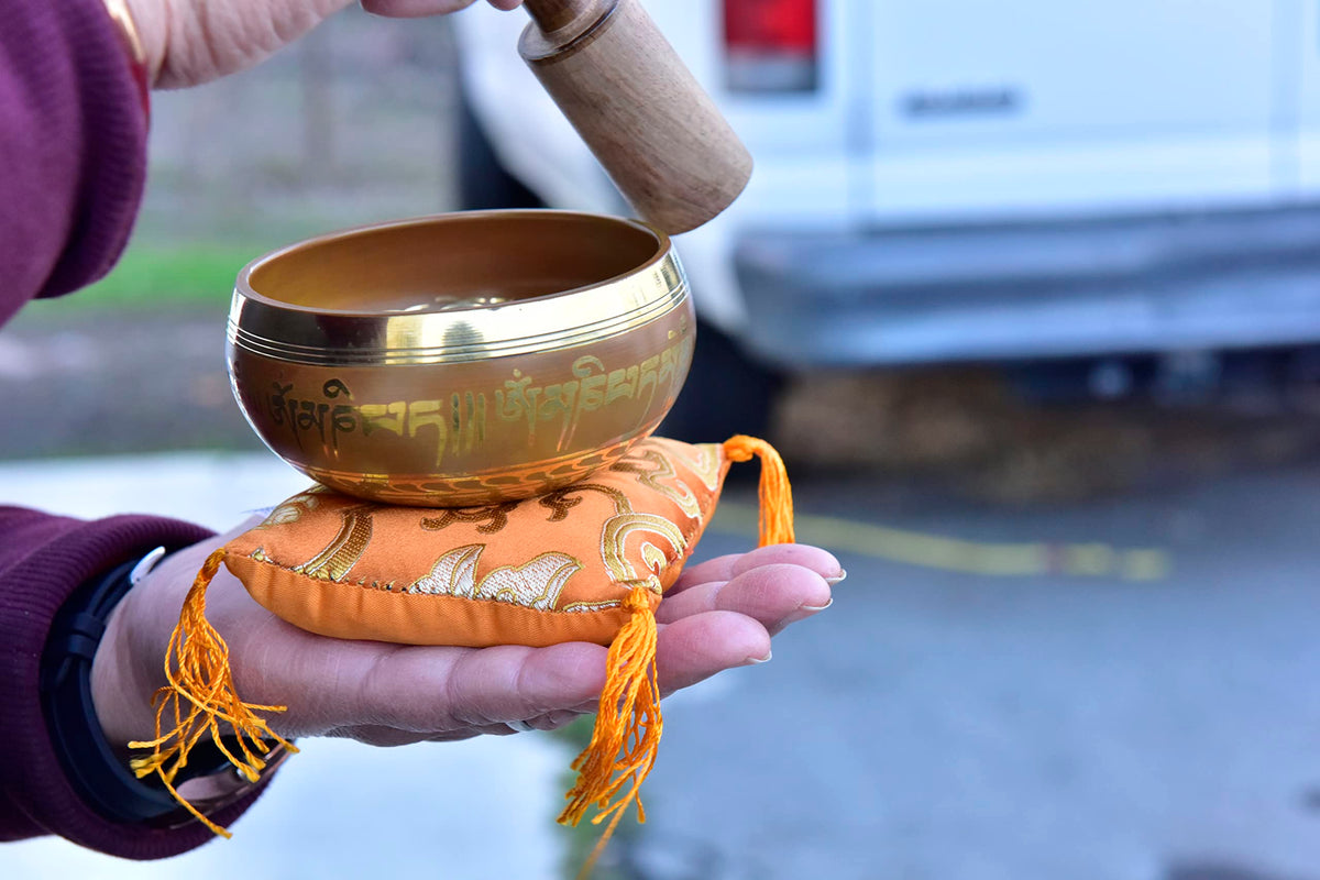 3.75'' Tibetan Meditation Yoga Singing Bowl Green Set With Free Wooden Mallet And Silk Cushion From Nepal, Singing Bowls. (Orang