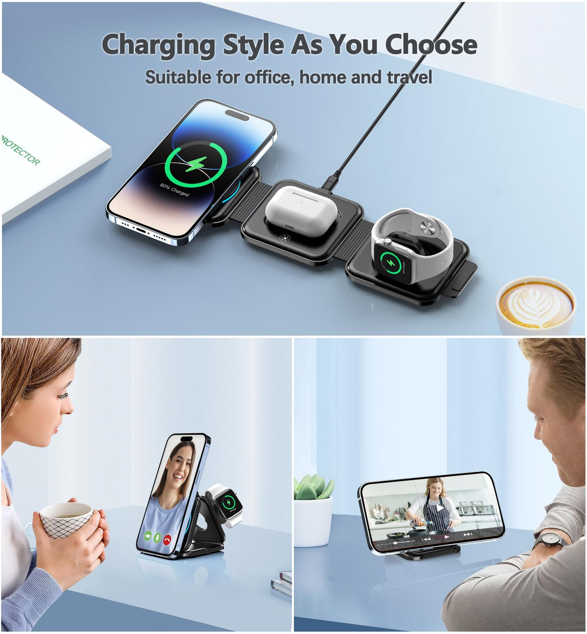 3 In 1 Foldable Wireless Mag-Safe Charging Station For Apple Devicesthe New 2024 Wireless Charging Station Is Designed With A Strong Magnetic ''Little Ear'' Stand, Which Can Be Folded Into A Sturdy Wireless Charger Stand And Supports Three Folding Charging Modes. Essential Partner For Apple Series?With The 3-In-1 Wireless Apple Charging Station, You Can Wirelessly Charge Mag-Safe Compatible Iphones, Airpods, And Iwatch Simultaneously, Eliminating Cable Clutter And Simplifying Your Daily Charging Routine. Compatible With Iphone: Latest Iphone Cellular Devices And Iphone 16/16 Plus/16 Pro/16 Pro Max15/15 Plus/15 Pro/15 Pro Max/14/14 Plus/14 Pro/14 Pro Max/13/13 Mini/13 Pro/13 Pro Max/12/12 Mini/12 Pro/12 Pro Max Compatible With Airpods: Airpods 2, Airpods 3, Airpods Pro 2Nd Gen, Airpods Pro Compatible With Iwatch: Iwatch Ultra/8/7/6/ Se/ 5/ 4/ 3/ 2 Note:For Best Results, Charge With Or Without A Mag-Safe Case. Incompatible Regular Iphone Cases Can Weaken The Magnetic Connection. Precautions For Use 1. When The Indicator Light Is Flashing, It Indicates Abnormal Charging, Please Check The Surrounding Area For Foreign Objects. 2.This Magnetic Wireless Charger Only Supports The Apple Watch. 3.Avoid Metal Objects Such As Magnets And Keys From Affecting Charging When Charging. 4.The 3 In 1 Charging Station Apple Has A Temperature Control Function. When The Temperature Reaches 40 Degrees, It Will Automatically Stop Charging. If The Temperature Is Normal, It Will Continue Charging.