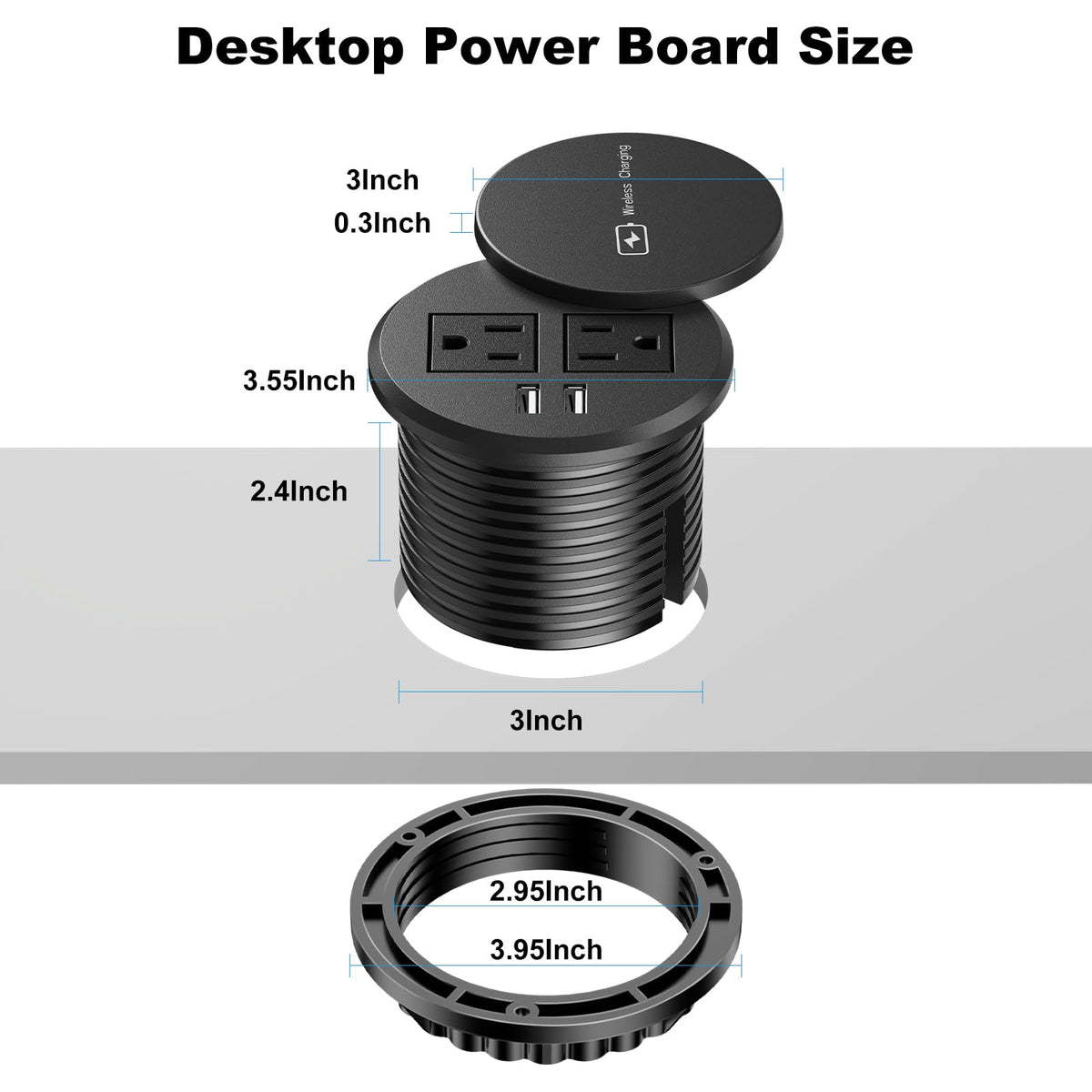 3 Inch Desk Hole Recessed Power Grommet With 15W Wireless Charger Cover, 2 Usb A Countertop Grommet Mount Power Outlet, With Ac