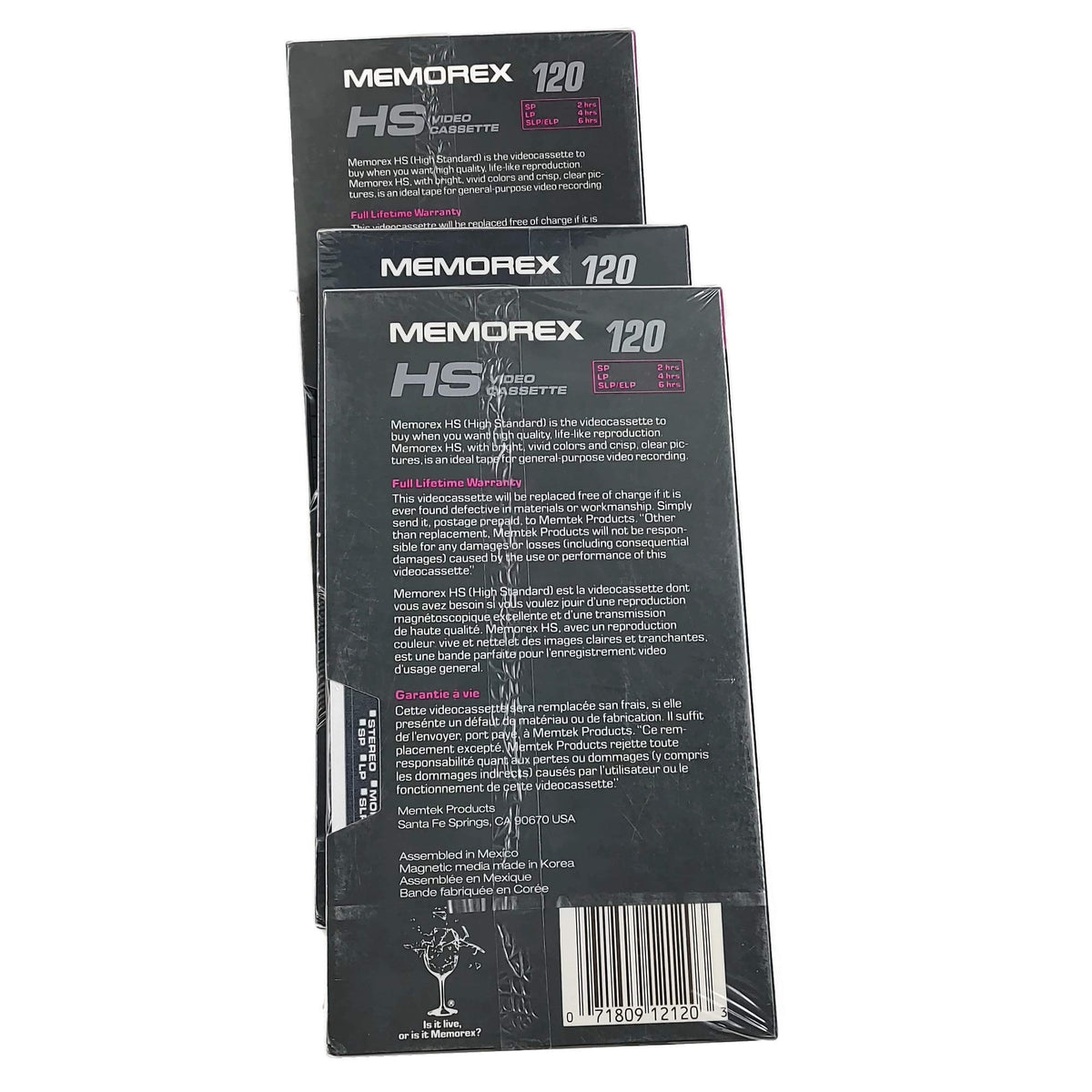 Q: What type of video tapes are included in the 3 Pack HS T-120?A: The 3 Pack HS T-120 includes Memorex VHS tapes that are specifically designed for recording and playback of video content.