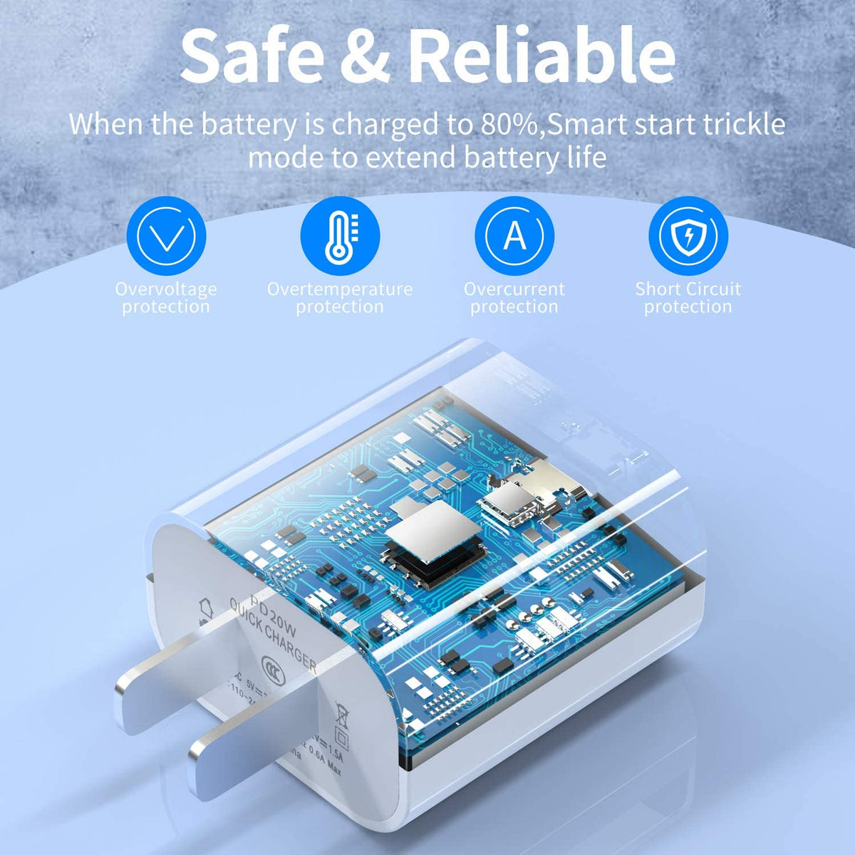 Apple Mfi Certified Iphone 20W Pd Usb C Power Fast Charger Iphone Fast Charger 20W Usb C Fast Wall Charger With 6Ft C To Lightning Cable Type C Charger Adapter Fast Charging Makes Your Iphone 1414 Pro 14Pro Max13 Pro1212Mini12 Pro12 Pro Max1111 Pro11 Pro Maxxs Maxxsxrx88 Plus Up To 50% Power In 30 Minutes Increase The Power By More Than 1% Per Minute Until 80%, And Then Enter The Standard Charging Mode Superior Safety Fast Charging 20W Lightning Charger Charges Iphone 12 Up To 50% In Just 30 Minutesthe Wall Charger Built-In Over-Voltage Protection, Features A Stable Voltage Broad Compatibility Without Errors: Support Ios 151413121110987 System Without Operating Errors Fast Charging Speed Works With: Iphone 1414 Pro 14Pro Max13 Pro1212Mini12 Pro12 Pro Max1111 Pro11 Pro Maxxs Maxxsxrx88 Plus Standrad Charging Speed Works With: Iphone 77 Plus6S6S Plus66 Plusse5S55C, Ipad 4 Mini Air Pro, Ipod, Airpods What You Get : 3 X 20W Usb-C Iphone Charger Block 3 X 6Ft Usb-C To Lightning Charging Cord