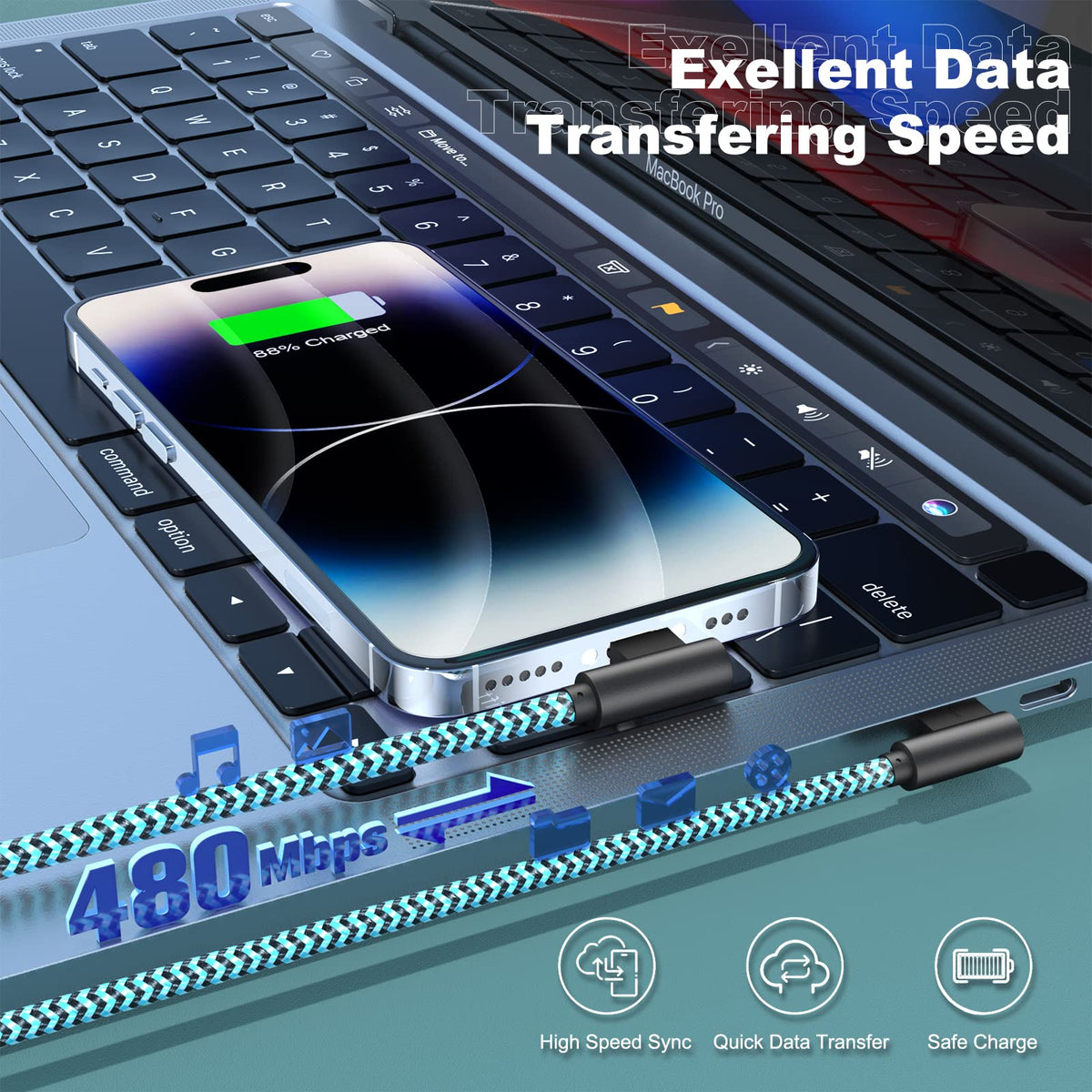 Q: What advantages does the right-angle design of the cable offer?A: The right-angle design of the cable helps prevent bending and breaking at the connector, which is a common issue with standard cables. This design also allows for a more convenient connection in tight spaces, making it easier to use your device while it is charging.