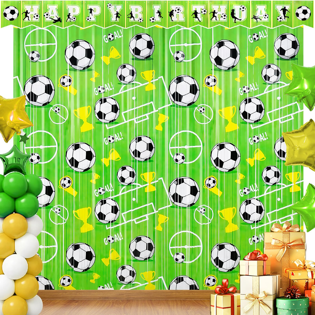 3 Pack Soccer Birthday Party Decorations With 2Pcs Green Metallic Tinsel Foil Fringe Curtains And 1Pcs Birthday Banner For Photo