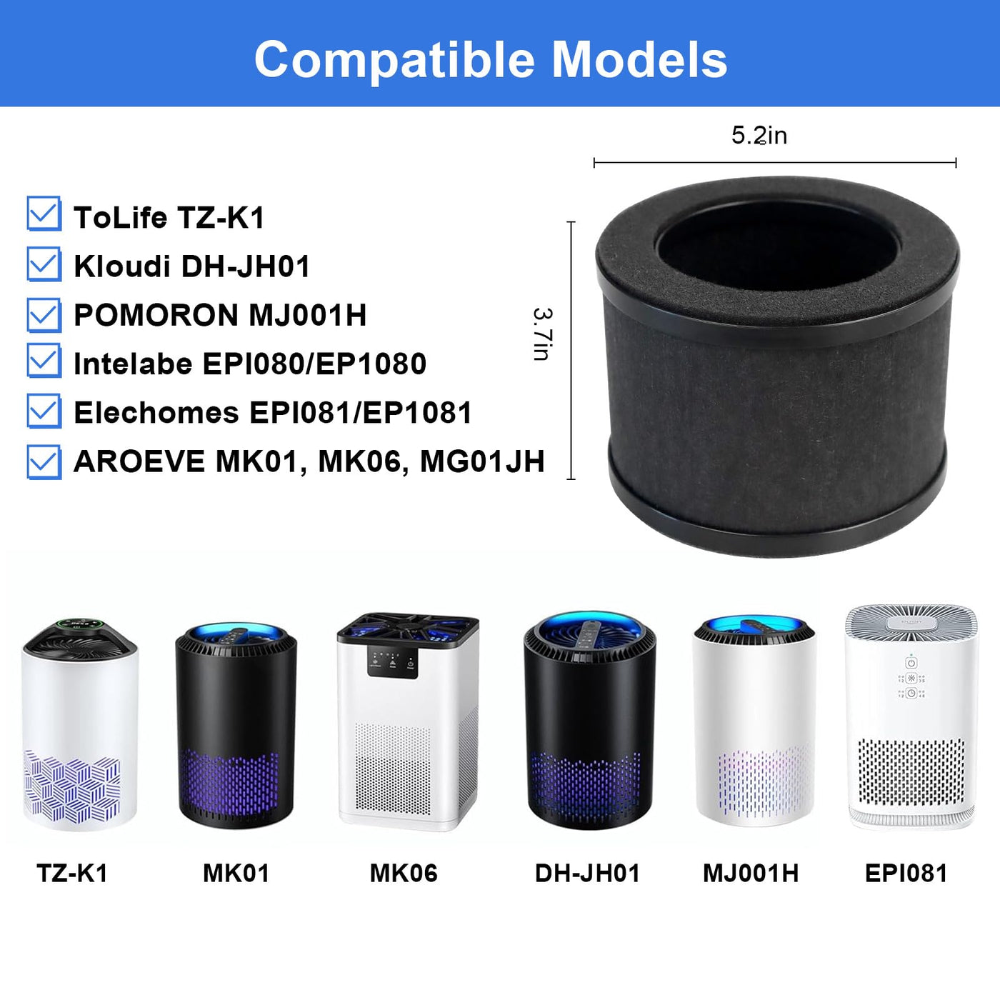 Q: What air purifier models are compatible with the TZ-K1 Replacement Filters?A: The TZ-K1 Replacement Filters are compatible with the ToLife TZ-K1 Filter, as well as the AROEVE MK01, MK06, and MG01JH filters. Additionally, they also fit the FreAire 6391RGB and Kloudi DH-JH01 models. Always check your model number before purchasing to ensure compatibility.