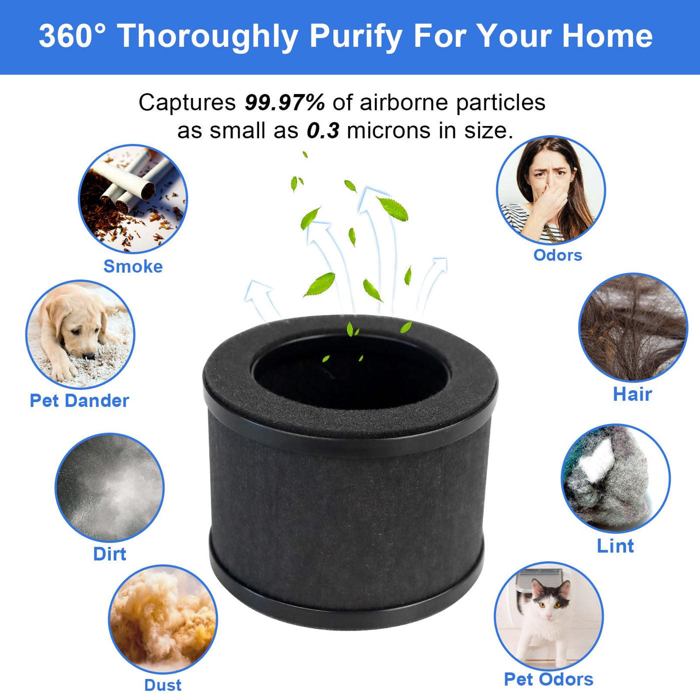 Q: How does the 3-in-1 filtration system work in these replacement filters?A: The 3-in-1 filtration system consists of a Pre-Filter, Post Filter, and Activated Carbon Filter, working together to capture and eliminate up to 99.97% of airborne particles down to 0.3 microns. This includes dust, pet dander, smoke, and other allergens, enhancing your indoor air quality.