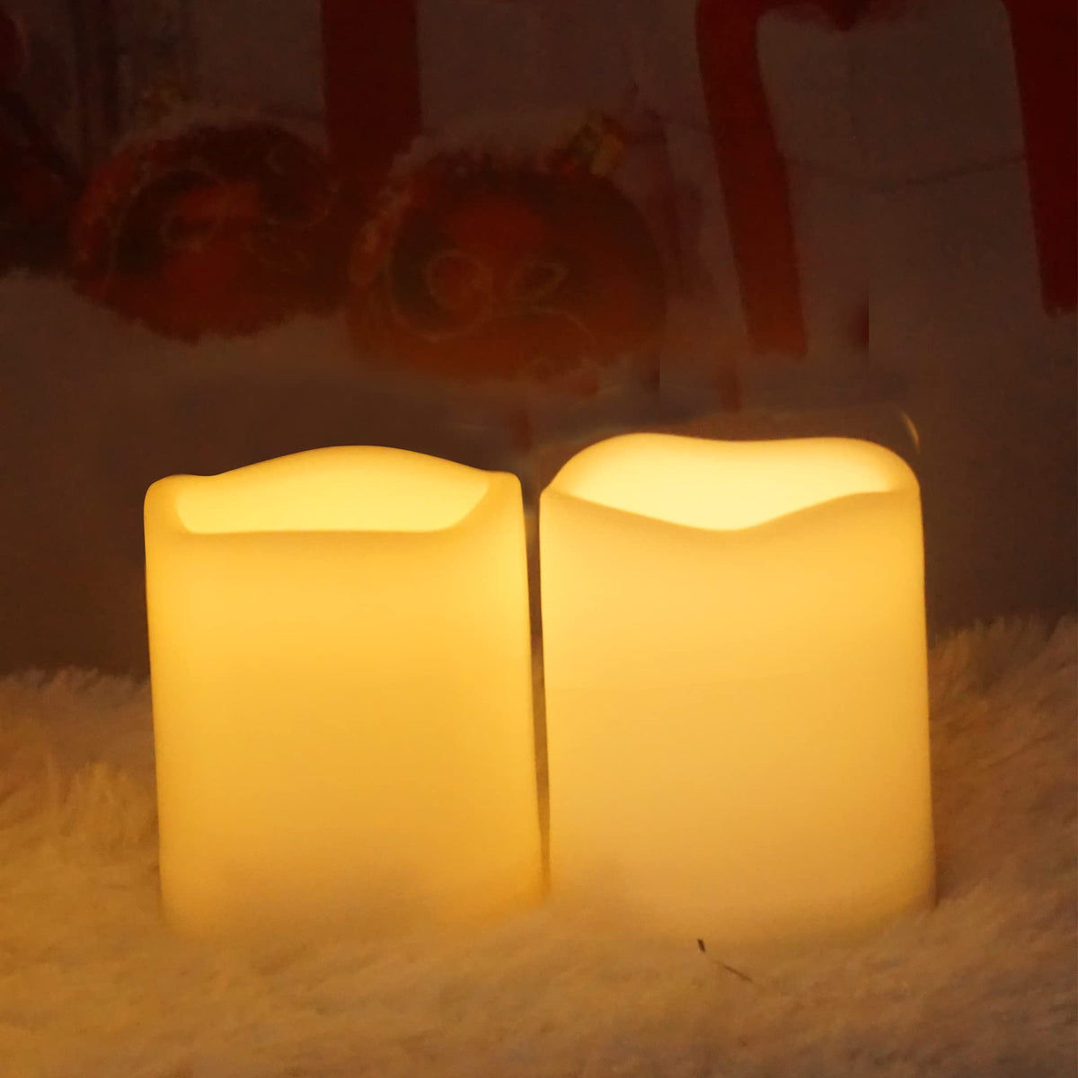 3''X3'' 4 Pack With Timing Function Specifications 1.Material: Plastic. 2.Shape: Pillar. 3.Size: 3 In Diameter, 3 In Height. Battery Required: 2 Aa (Not Included).