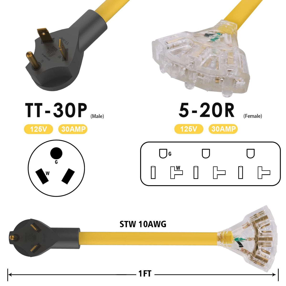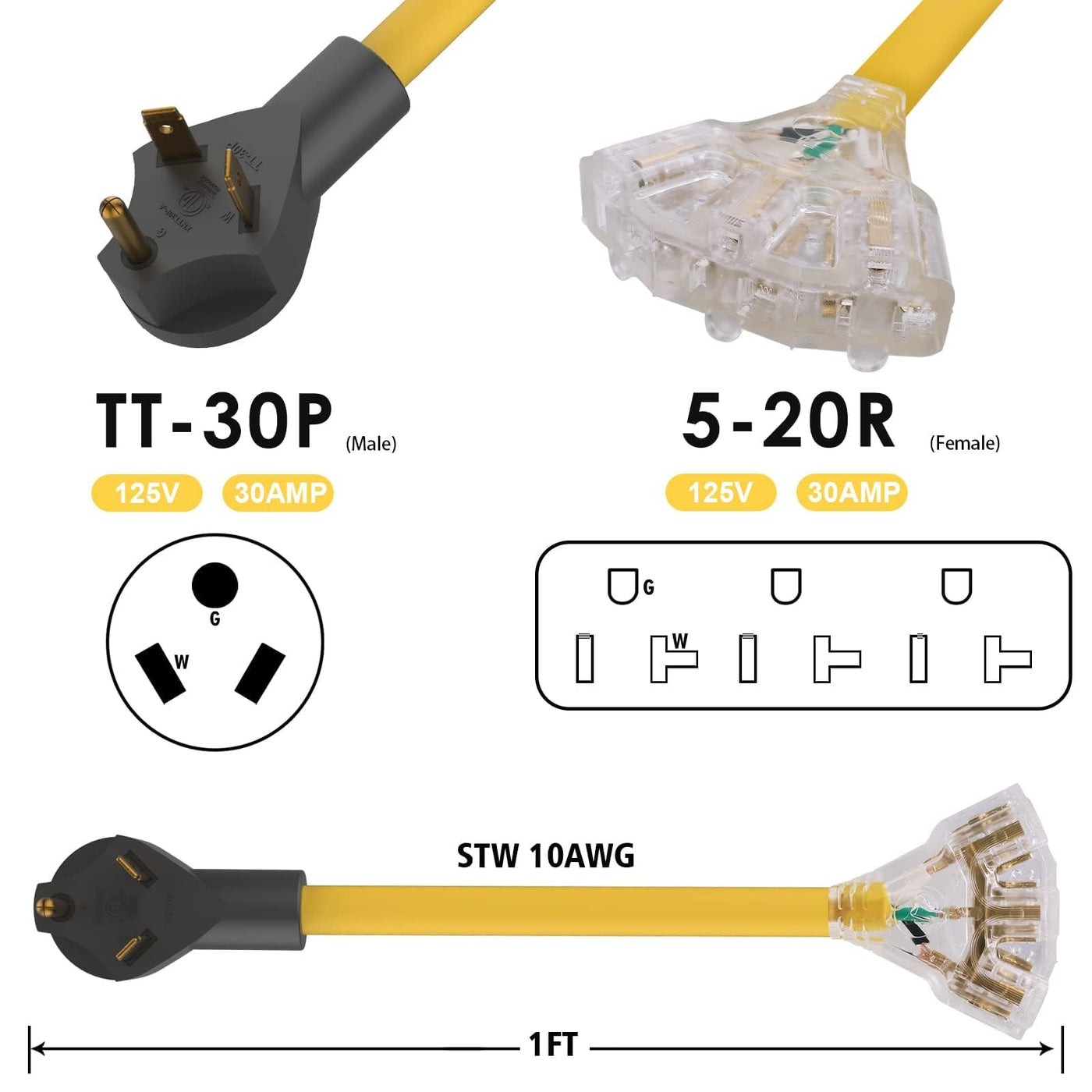 30 Amp To 20 Amp Adapter 110 Rv Distribution Nema Tt-30P Male To 3X 5-20R 1 Ft Household Outlet Female 30Amp Plug Splitter To 15 Amp 5-15/5-20 1Ft