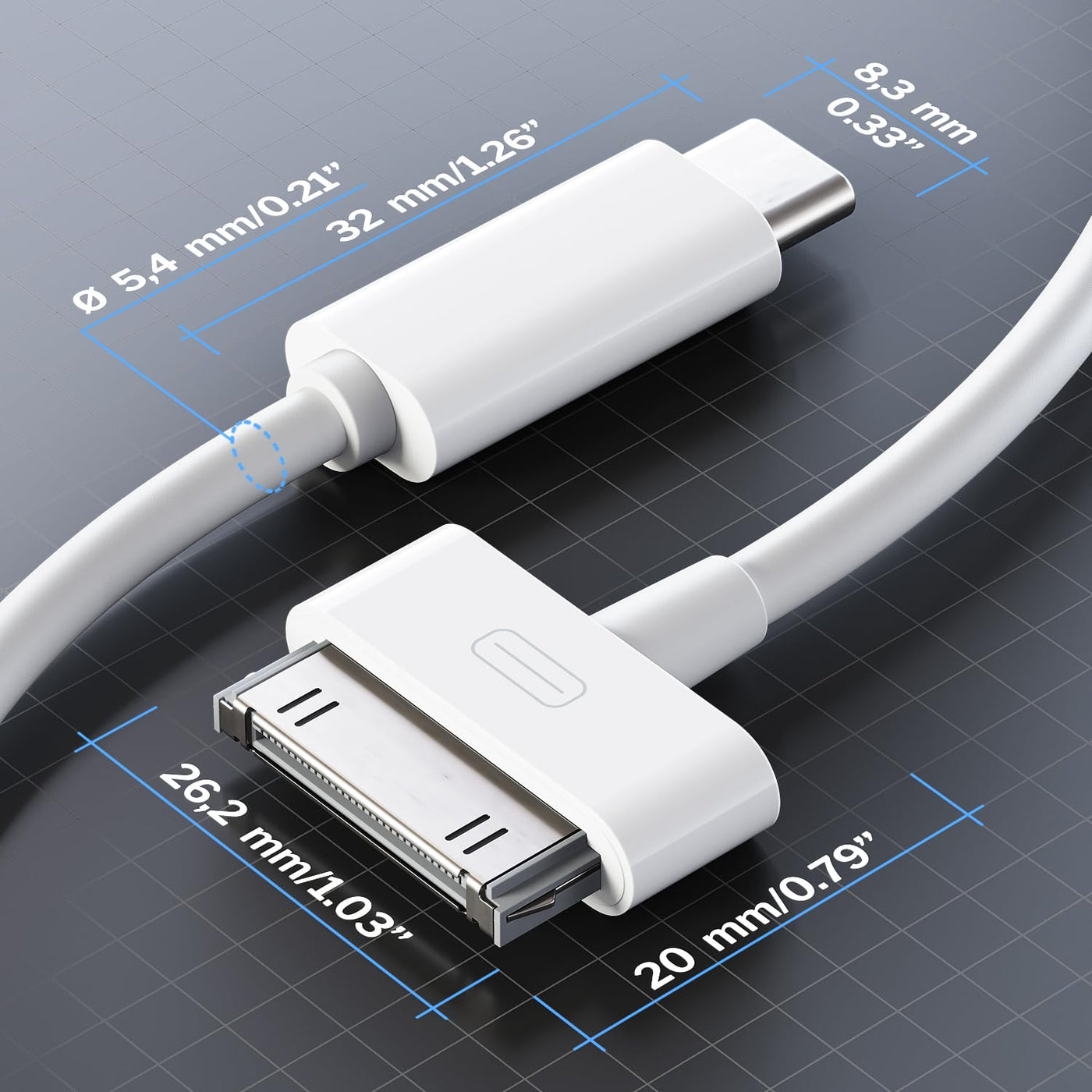 Q: How long is the 30-Pin to USB C Adapter Cable?A: The cable measures 6 feet in length, providing ample reach for connecting your devices to USB-C chargers or computers without hassle.