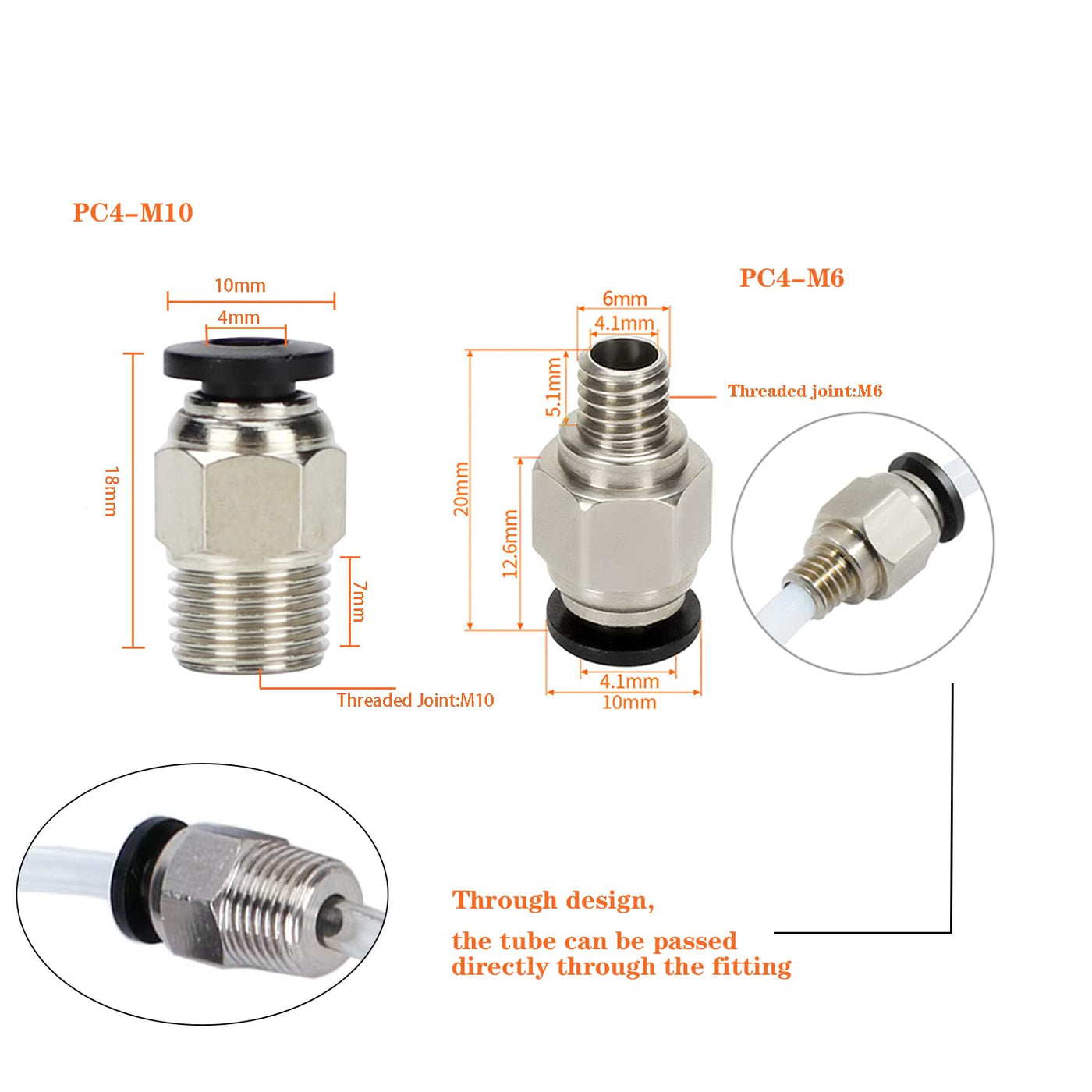 Q: What are the specifications of the pneumatic fittings included in the kit?A: The package includes four PC4-M6 fittings for the extruder and four PC4-M10 couplers for the hot end, both designed for use with the 4mm inner diameter of the Teflon tube.