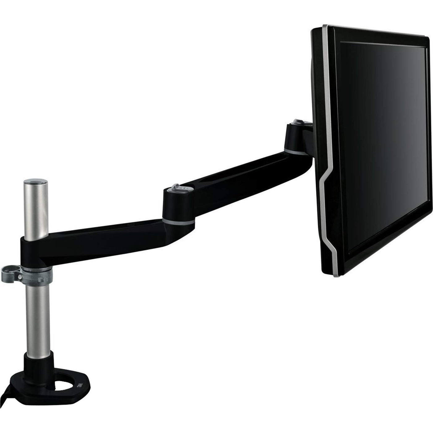 Q: What type of mounting options does this monitor arm offer?A: The 3M Dual-Swivel Monitor Arm includes clamp and grommet mount hardware, which can fit desks up to 2.36 inches thick.