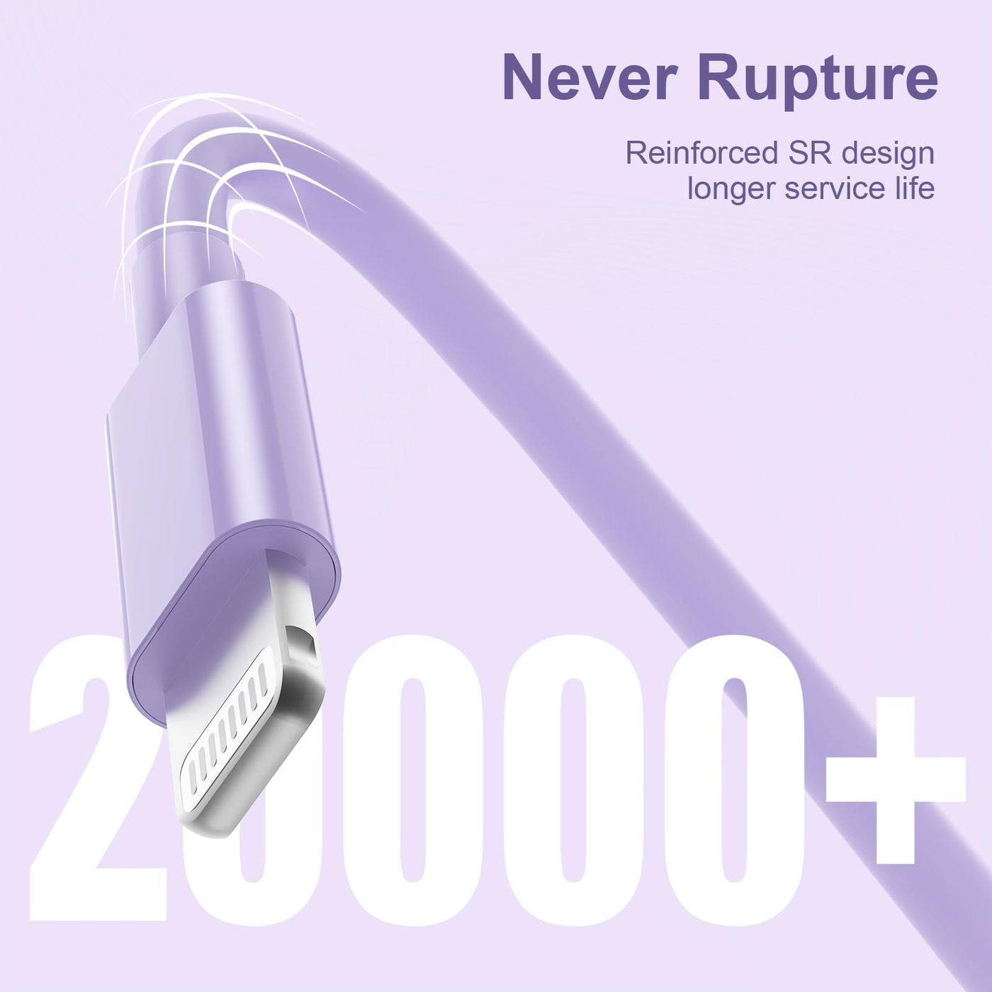 Q: How durable is the 6ft iPhone Charger Cord?A: The charger cord is designed to withstand up to 20,000 bends, thanks to its high-quality materials including heat-resistant aluminum alloy, ensuring long-lasting durability.