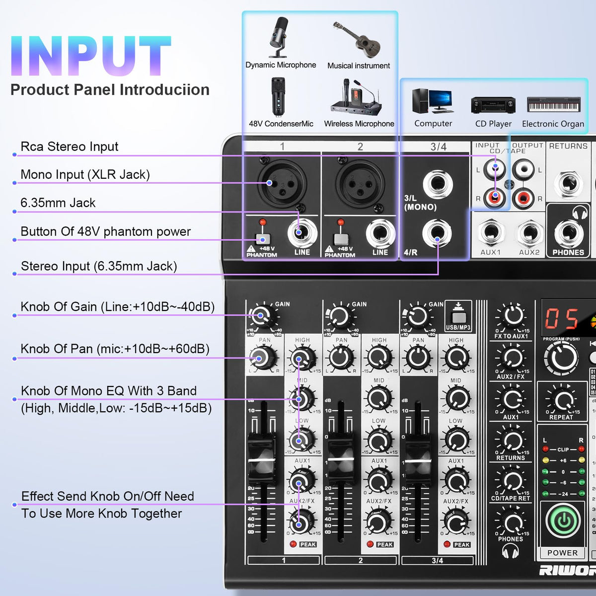 4 Channel Audio Interfacer Dj Mixer Sound Board 16 Bit Dsp Effect Usb Audio Mixer Effects +48V Phantom Bluetooth For Karaoke Stu
