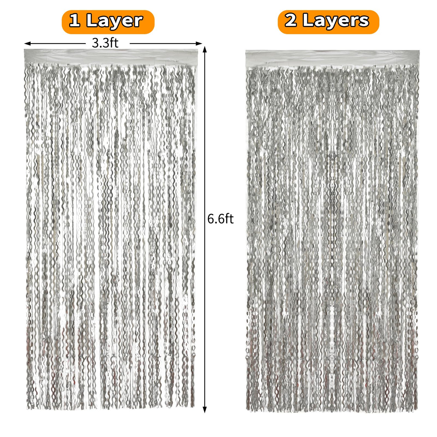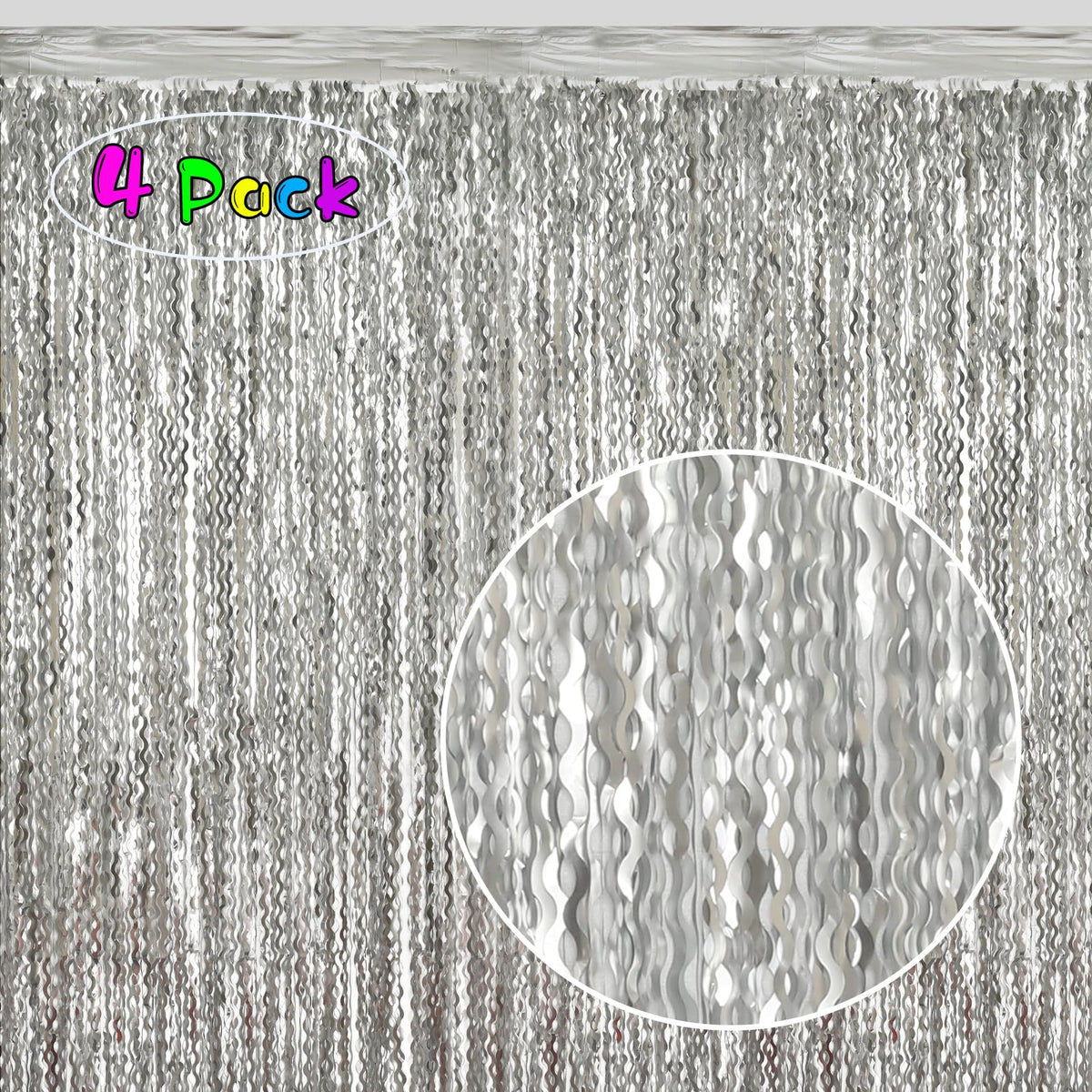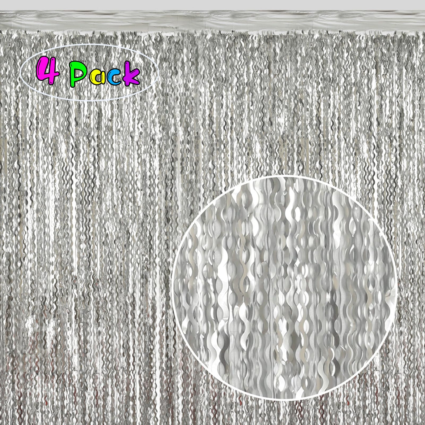 Q: What are the dimensions of each foil curtain in the 4 pack?A: Each foil curtain in the 4 pack measures 3.3 feet by 6.6 feet, providing ample coverage for your decoration needs.