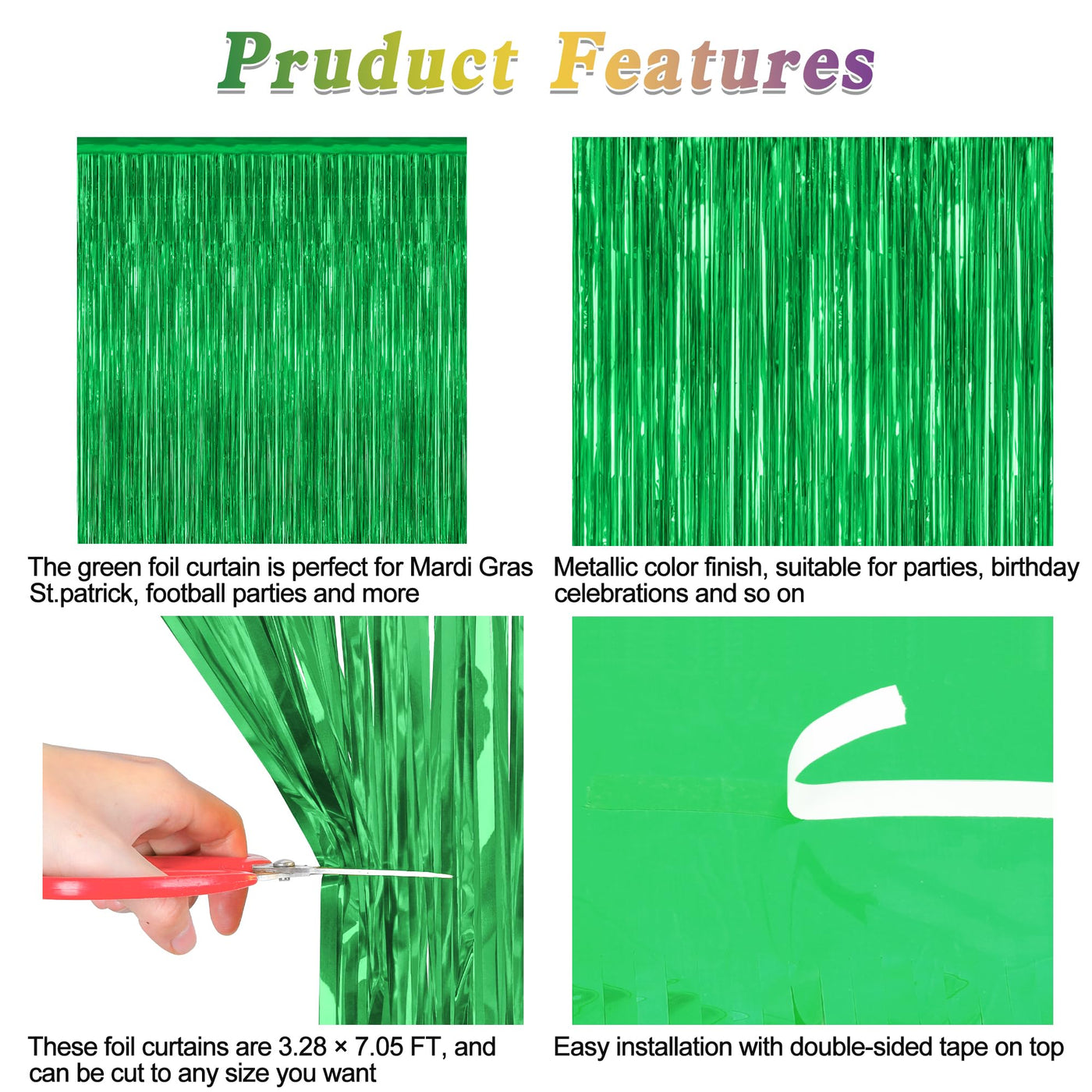 Celebrate Party With These Green Streamers! Quantity: 4 Pcs Size: 3.28 Ft X 7.05 Ft Colors: Green Design: Metallic Glossy Design Features: Large Size: Can Be Cut To Length As Needed Non-Tearable: 23 M Pet Material, Lightweight And Non-Tearable Easy To Install: Comes With Adhesive Tape, No Assembly Required Use Occasions: Mardi Gras, St.Patrick, Football Celebration Gathering, Game Day Warm Tips: The Green Tinsel Come With Adhesive Paper, But Please Do Not Stick Them On Rough And Uneven Surfaces.