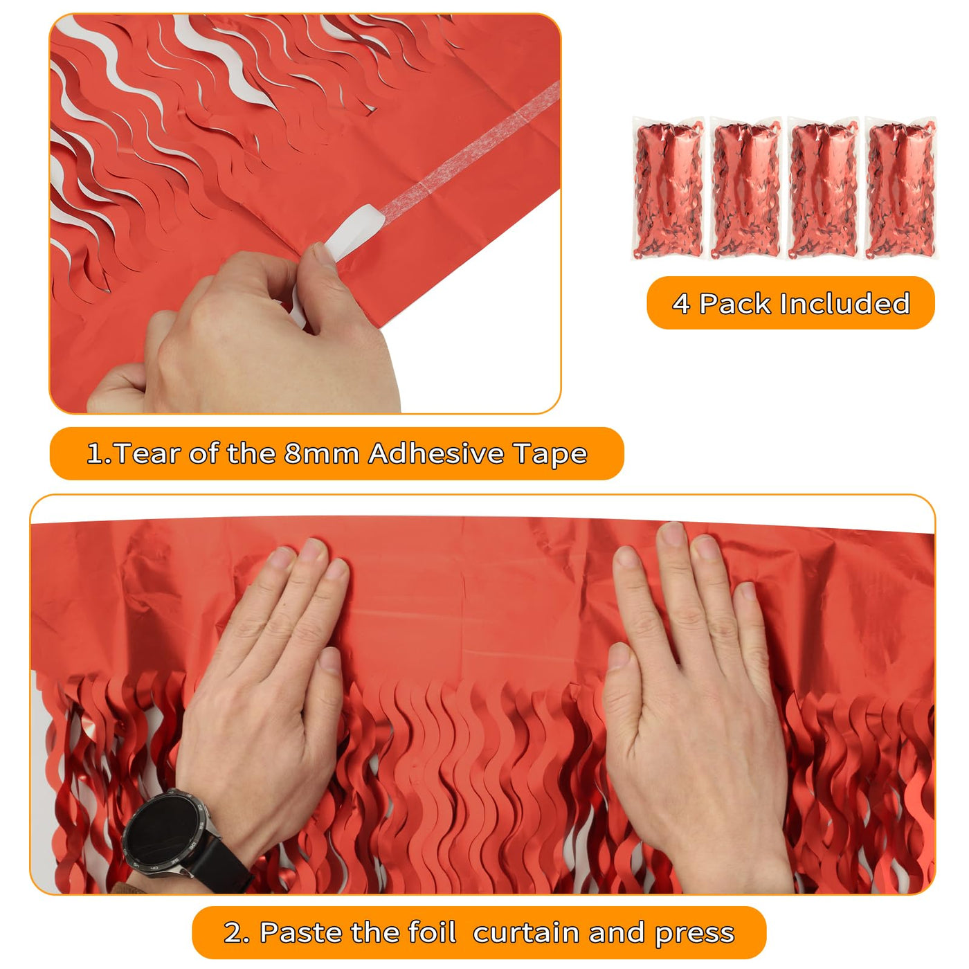 Q: How do I install the red tinsel backdrop?A: The red foil curtain backdrop comes with double-sided tape on the top. Simply peel off the tape and stick it to any smooth surface, such as walls, windows, or doors.