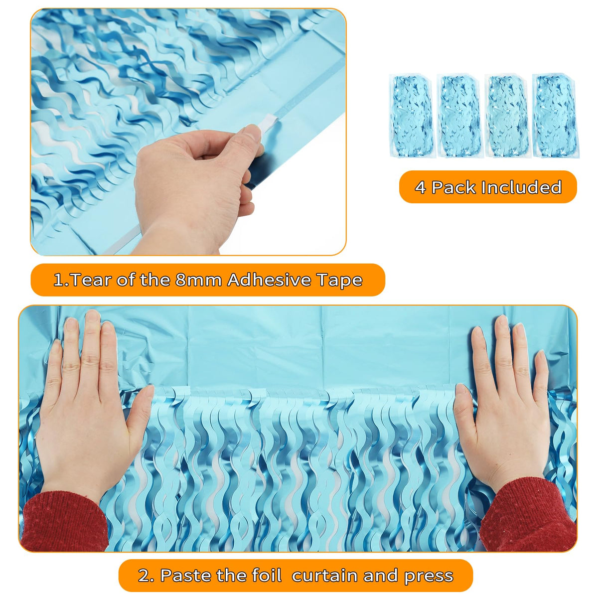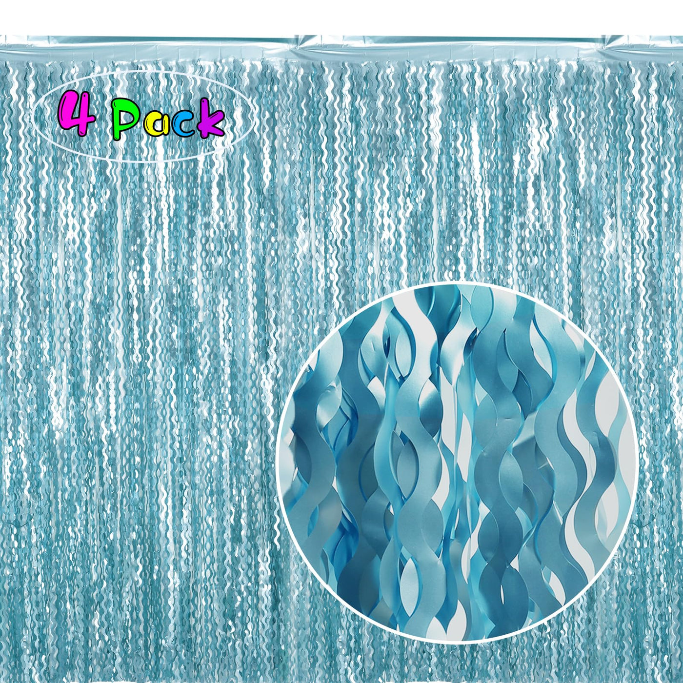 4 Pack Wavy Blue Foil Fringe Curtain 3.3X6.6 Feet | Blue Streamers Tinsel Backdrop For Under The Sea Party Decorations | Ocean B