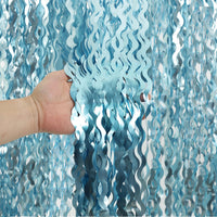 Q: What are the dimensions of each foil fringe curtain?A: Each wavy blue foil fringe curtain measures 3.3 feet in width and 6.6 feet in height, making them perfect for a variety of decorative uses.
